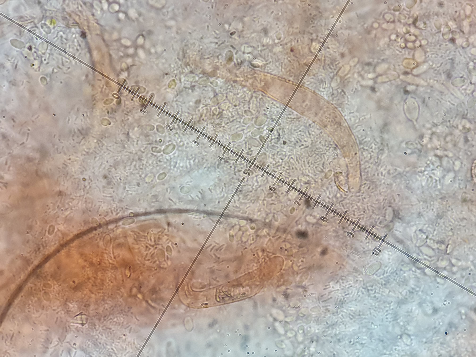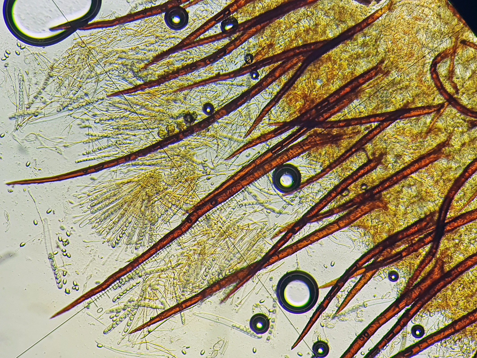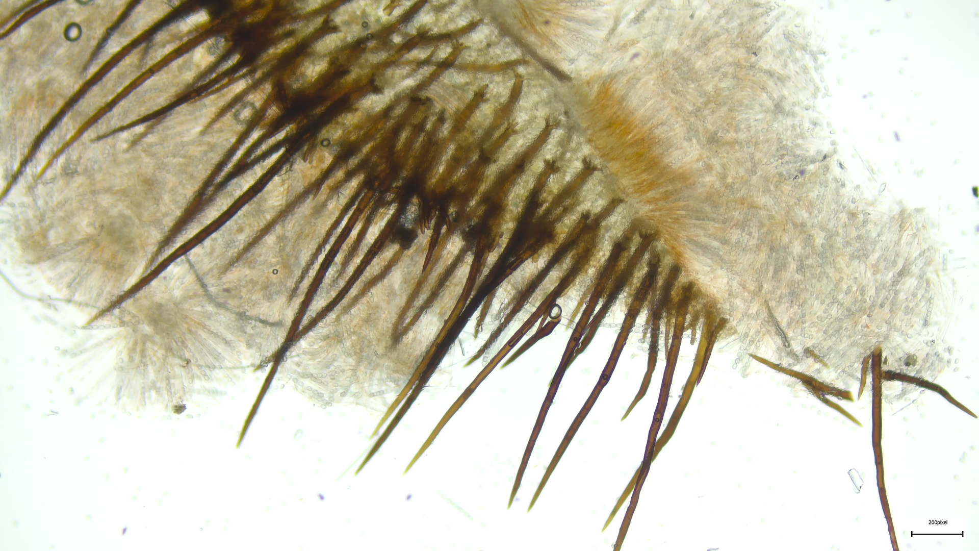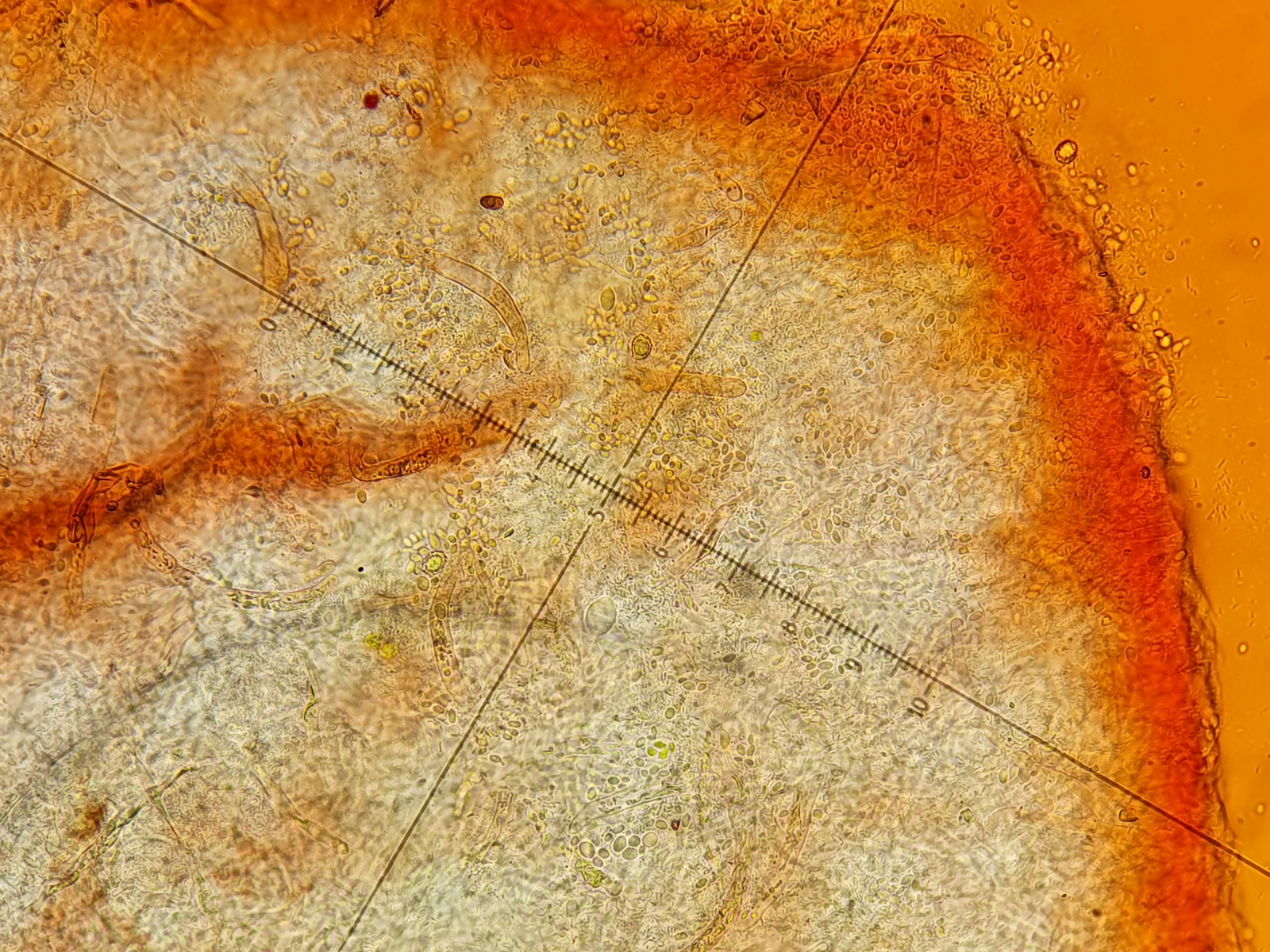 Die Schildborstlinge habe ich noch nicht mikroskopiert, mir ist jetzt etwas die Zeit davongallopiert. Ich denke aber, dass das Richtung Scutellina citrina gehen kann: