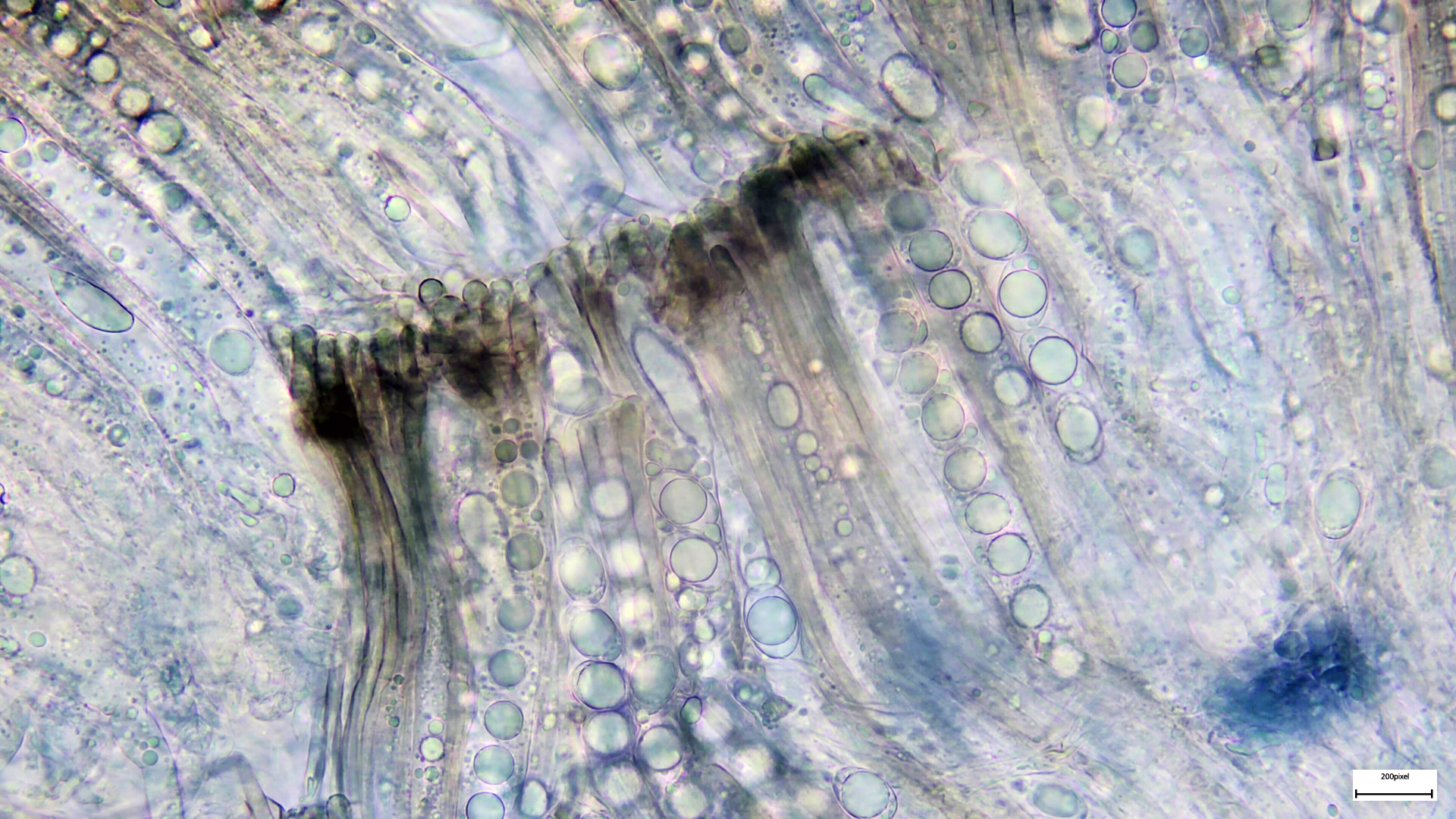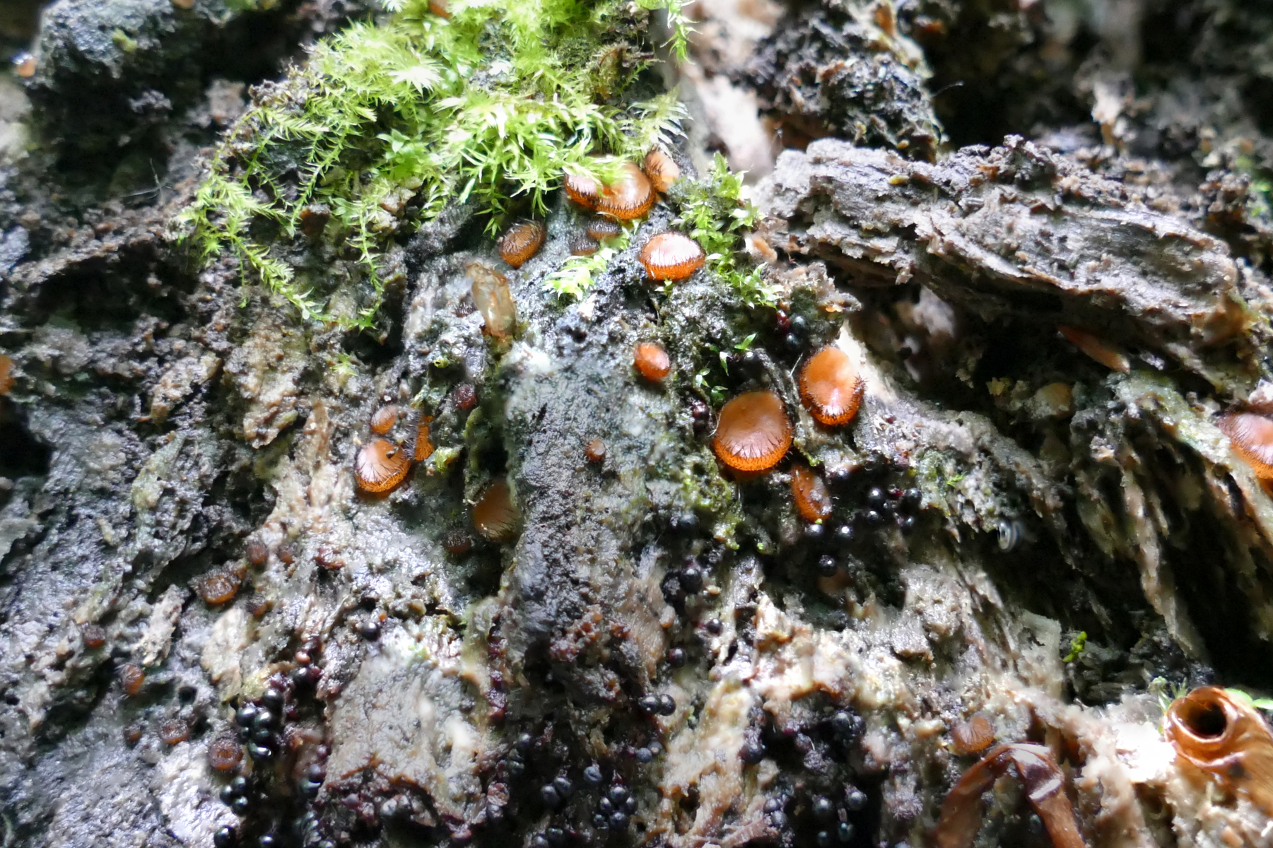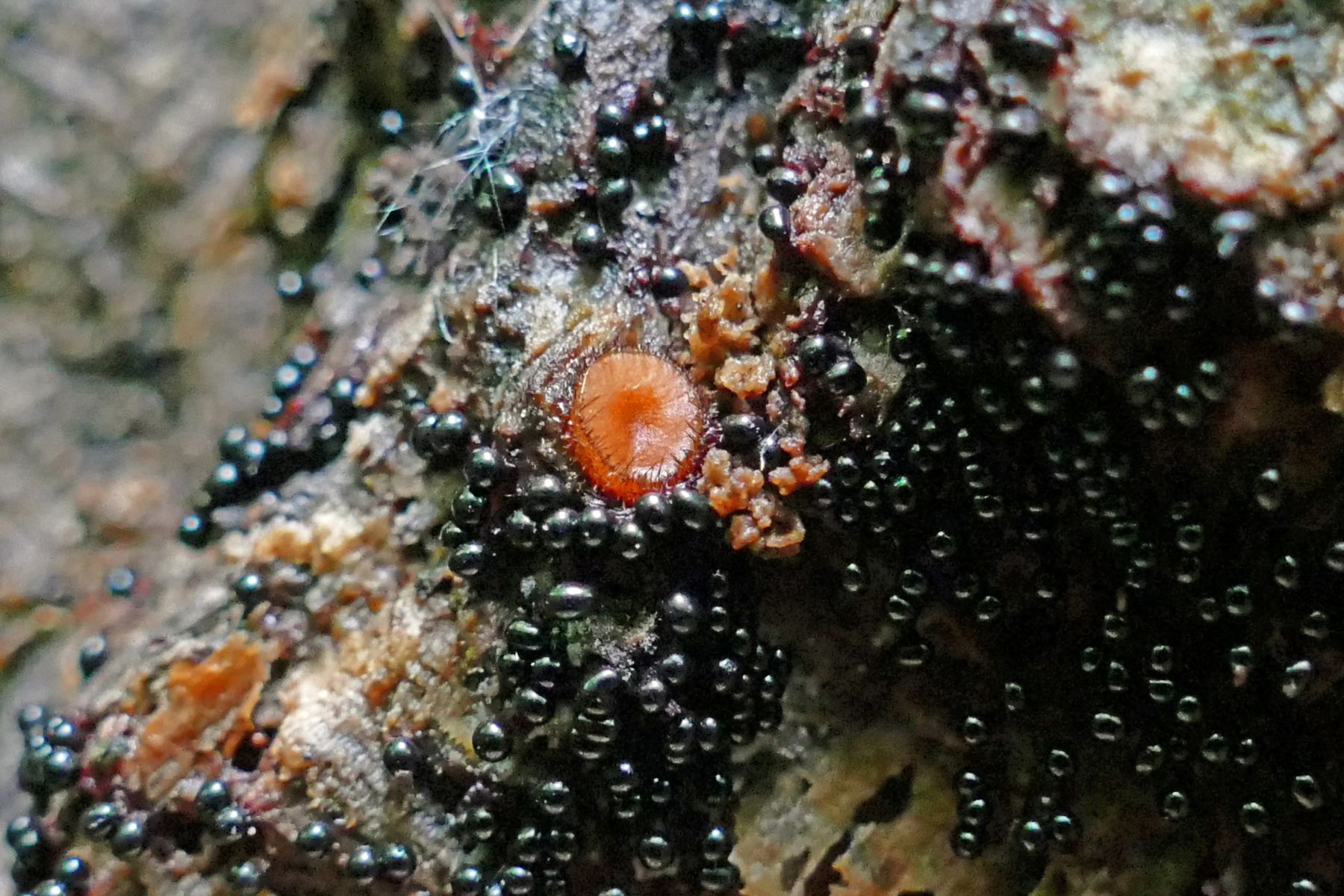 Die kleinen Schwarzen dazwischen sind wohl noch etwas anderes. Auch die müssen noch unters Mikroskop. Zu denen habe ich gar keine Idee. Da war ganz schön was los auf diesem alten Stamm.