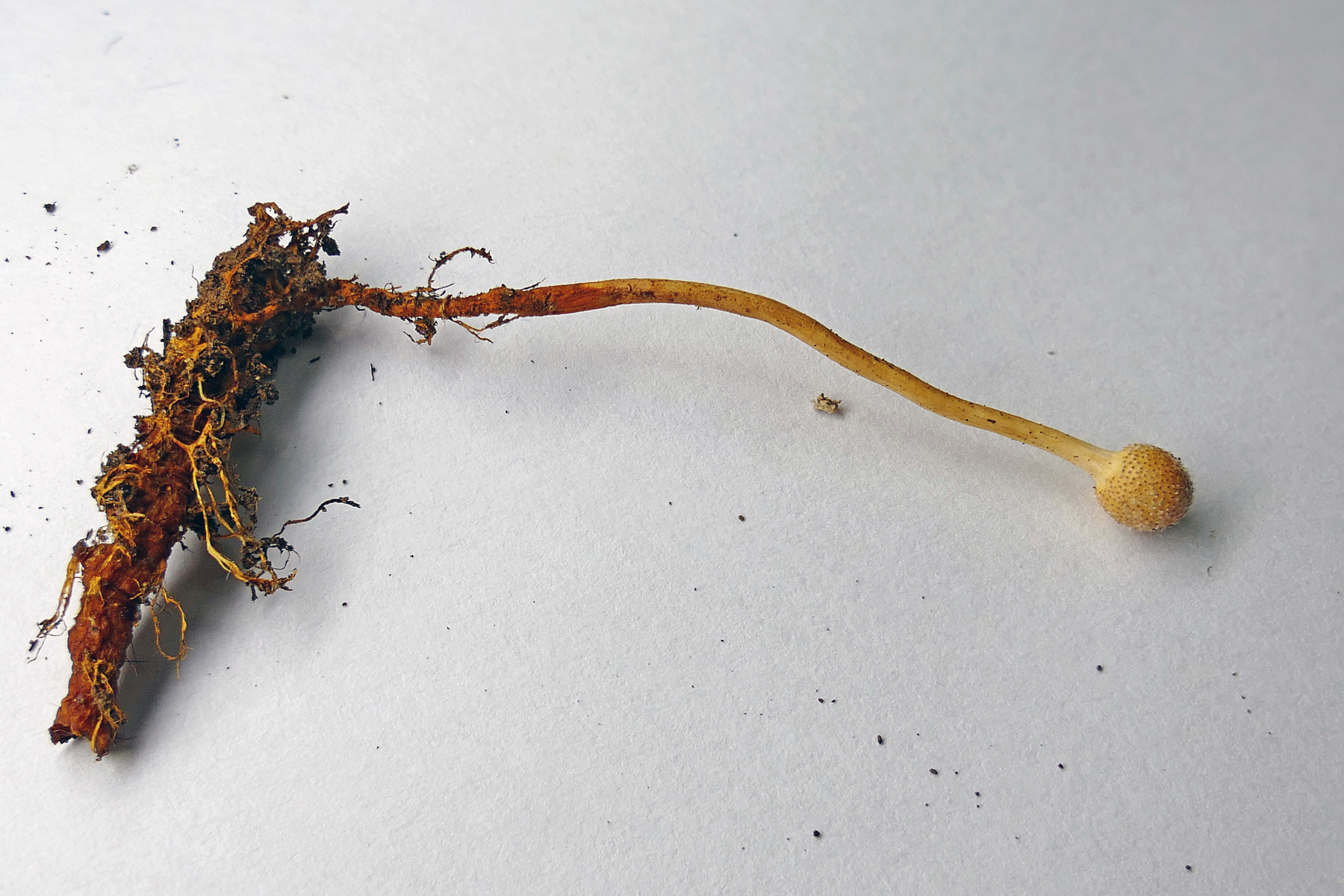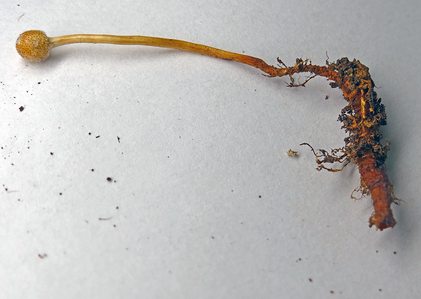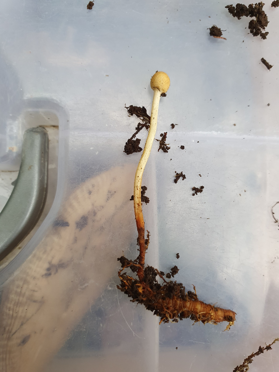 Das hatte ich doch schonmal in der Literatur gesehen. Nun aber vorsichtig mit dem Messer graben. Da sollte doch etwas am unteren Ende sein, wenn mich nicht alles täuscht. Ich wurde nicht enttäuscht: Ophiocordyceps gracilis: