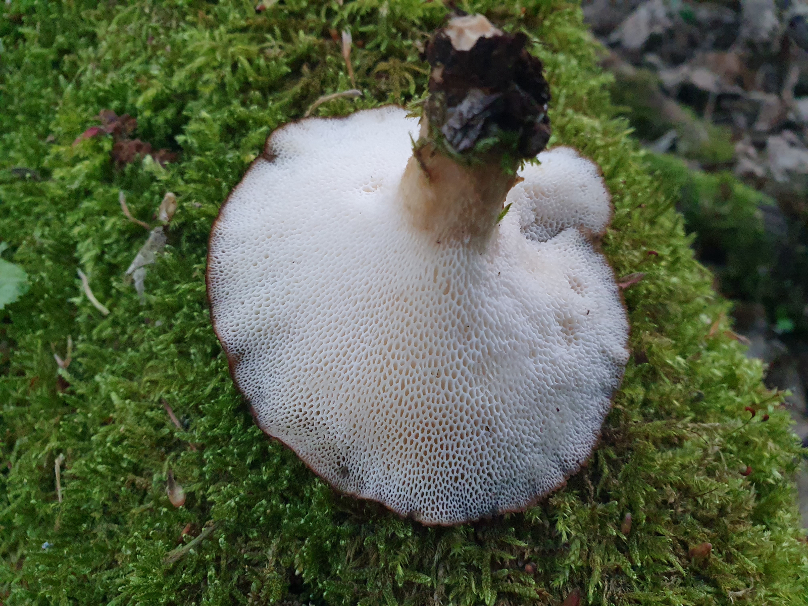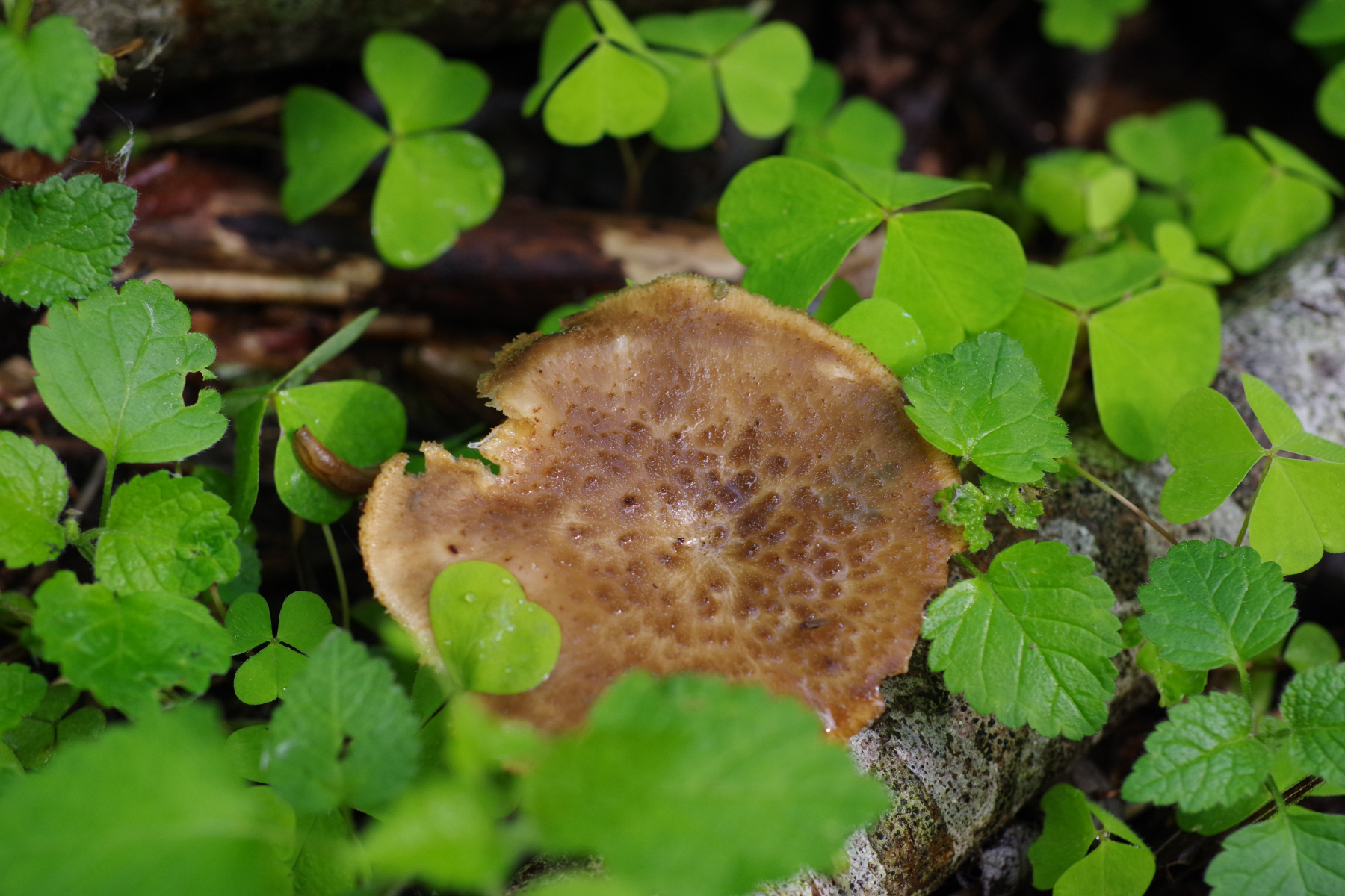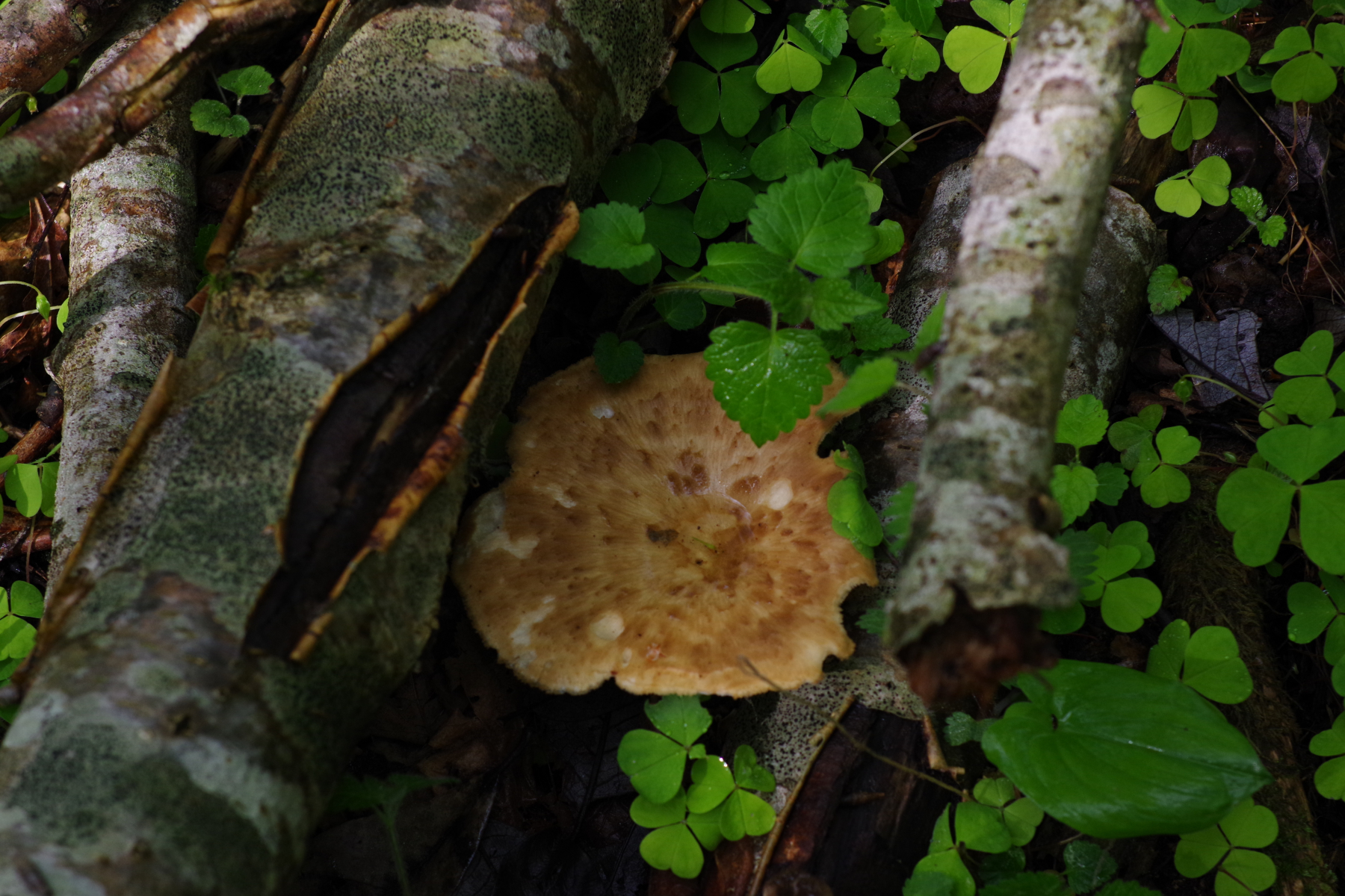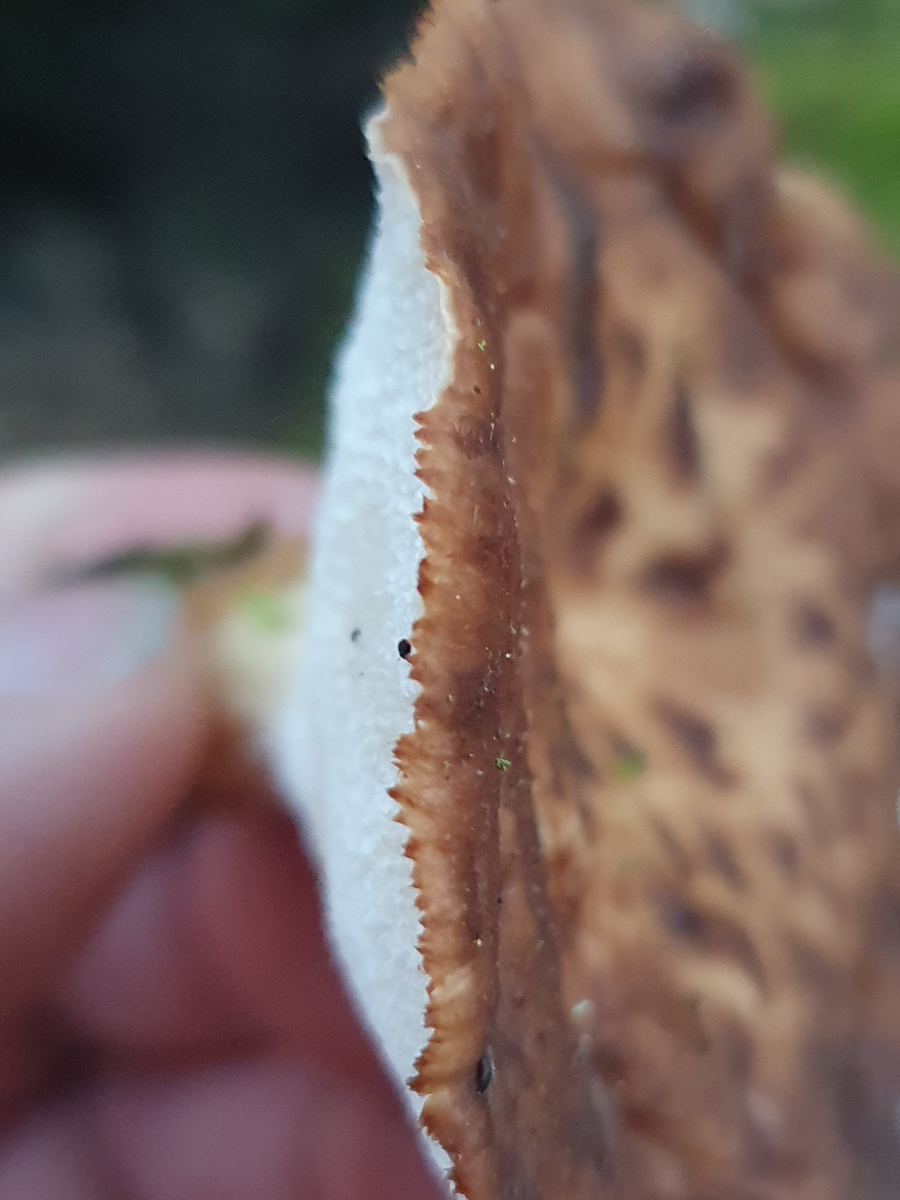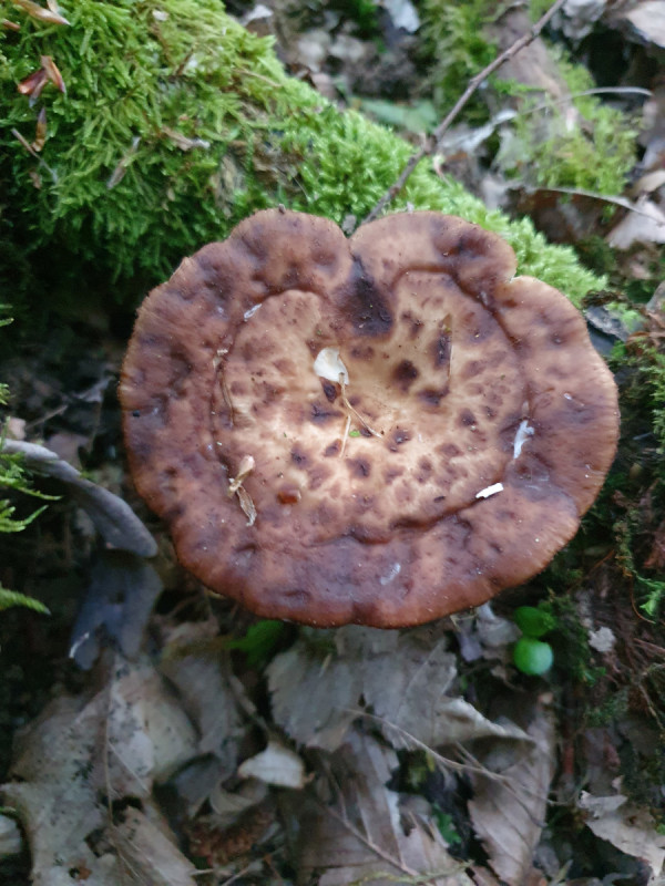 an Hasel und Eberesche, jeweils abgebrochen und liegend bzw. hängend, sprießen derzeit an mehreren Stellen diese Polyporusse. Ich vermute hier wegen der bei den größeren Exemplaren wenig ausgeprägten Schuppen P. tuberaster. Zudem sind an einem Substrat auch vorjährige mumifizierte Exemplare vorhanden, die größenmäßig eher zu dem kleineren der beiden Schuppigen passen.