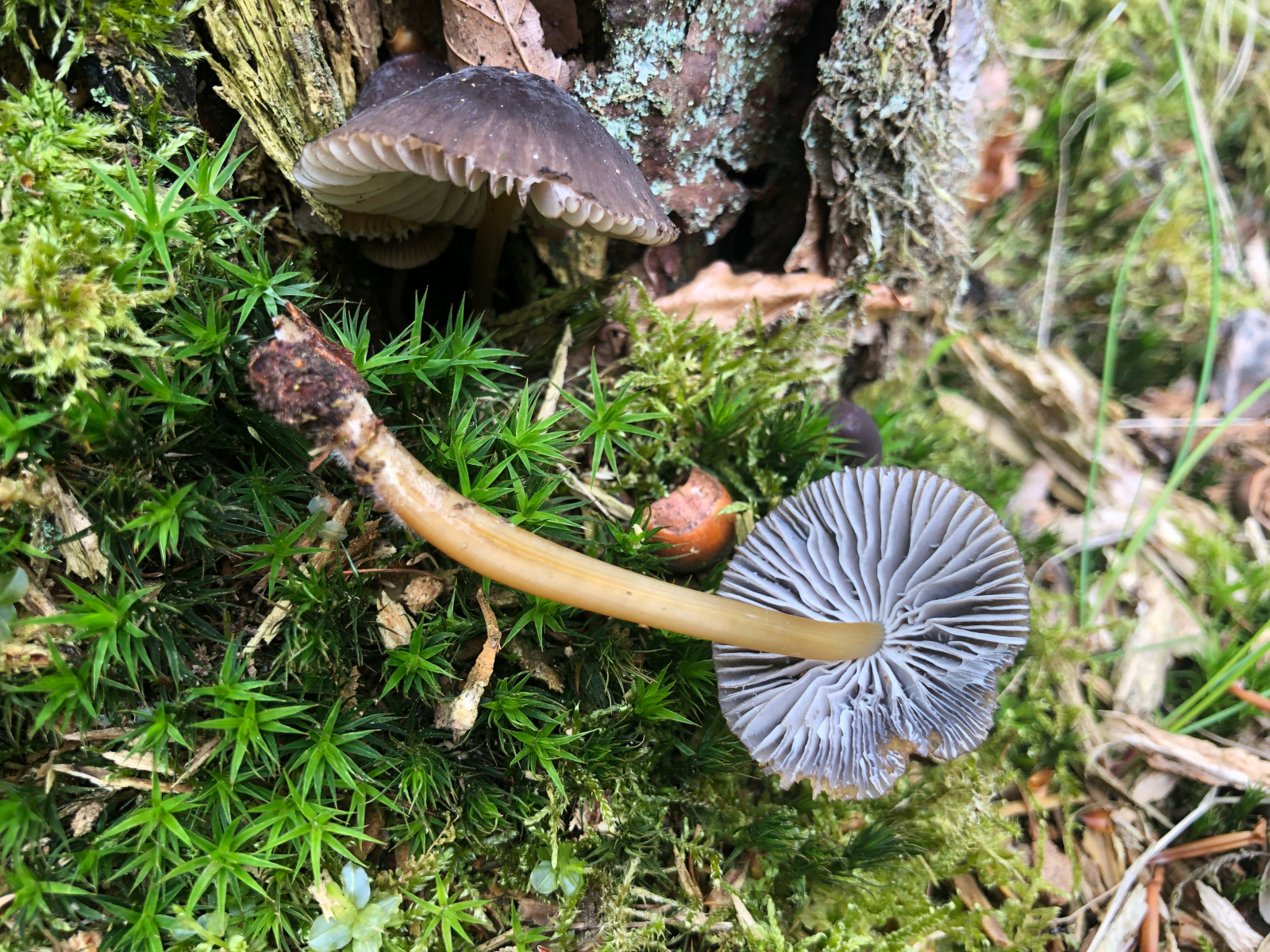 Der Stubben im Hintergund sieht nach morschem Nadelholz aus, womit M. inclinata eh aus dem Rennen wäre. Der hätte aber auch einen gebördelten Hutrand (wie z.B. Mycena haematopus), der deinem Pilz ebenfalls fehlt.