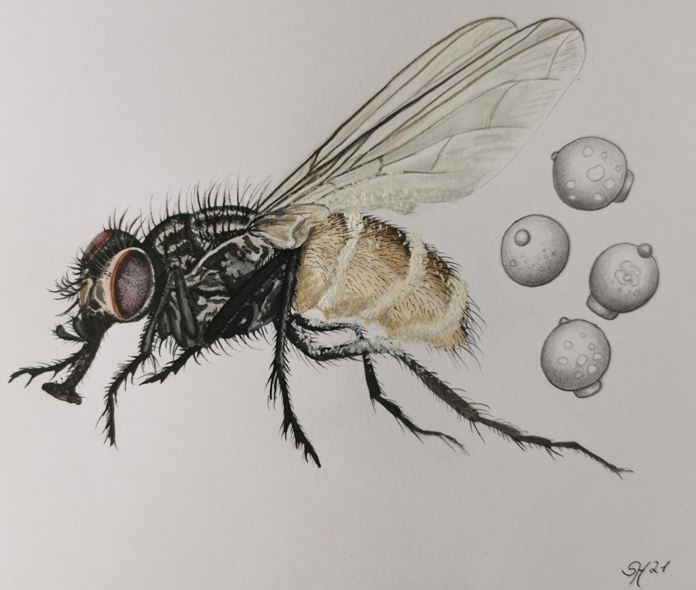 wir hatten eine etwas weniger weit geschritten befallene am Küchenfenster kleben. Sylvie hat sie dann mikroskopiert und aquarelliert - die Koidien sehen aus wie kleine Heißluftballons. Bestimmungsergebnis aufgrund der Konidien Entomophthora muscae ss. str.