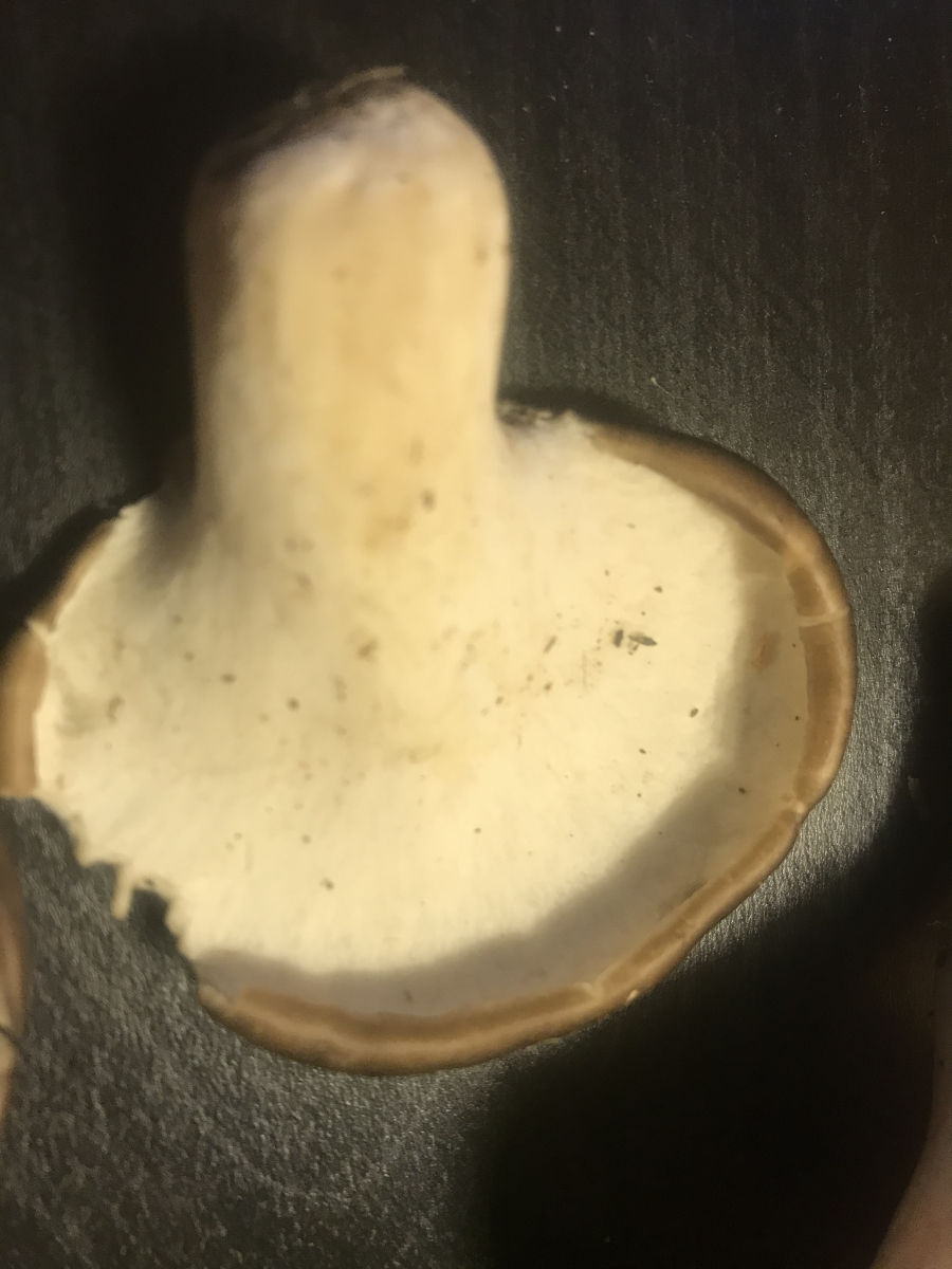 Ich habe heute diesen Seitlingartigen Pilz gefunden. Er wuchs an einem toten Baum, schockoladenbraun, glatt , Fleisch ist zart, riecht und schmeckt angenehm mild, hat jedoch keine Lamellen wie man die von Seitlingen kenntn, ehrer ganz kleine poren. Das Internet/ Bücher/ Apps hat mir bis jetzt nicht aushelfen können.