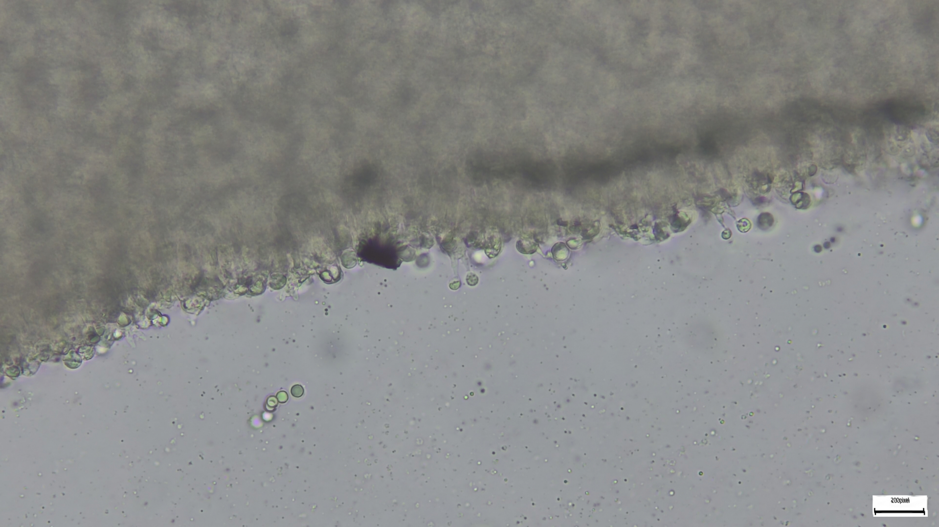Sporen (sub-)globos 6,8x6µm, rauh bis leicht warzig. Das spannende an den Sporen ist so eine Art Plage, hier ist die raue Oberfläche etwa gegenüber des deutlichen Apikulus kreisförmig unterbrochen (die Sporen haben eine Halbglatze
