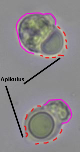 In deinem Fall sehe ich es genau anders rum als Du glaube ich. Das was herausquillt ist der Bereich mit dem geschäumten Inhalt (violett markiert). Der rot gestrichelte Teil ist der "intakte" Teil der Spore mit Apikulus und einem zusammengeflossenen Ölbereich.