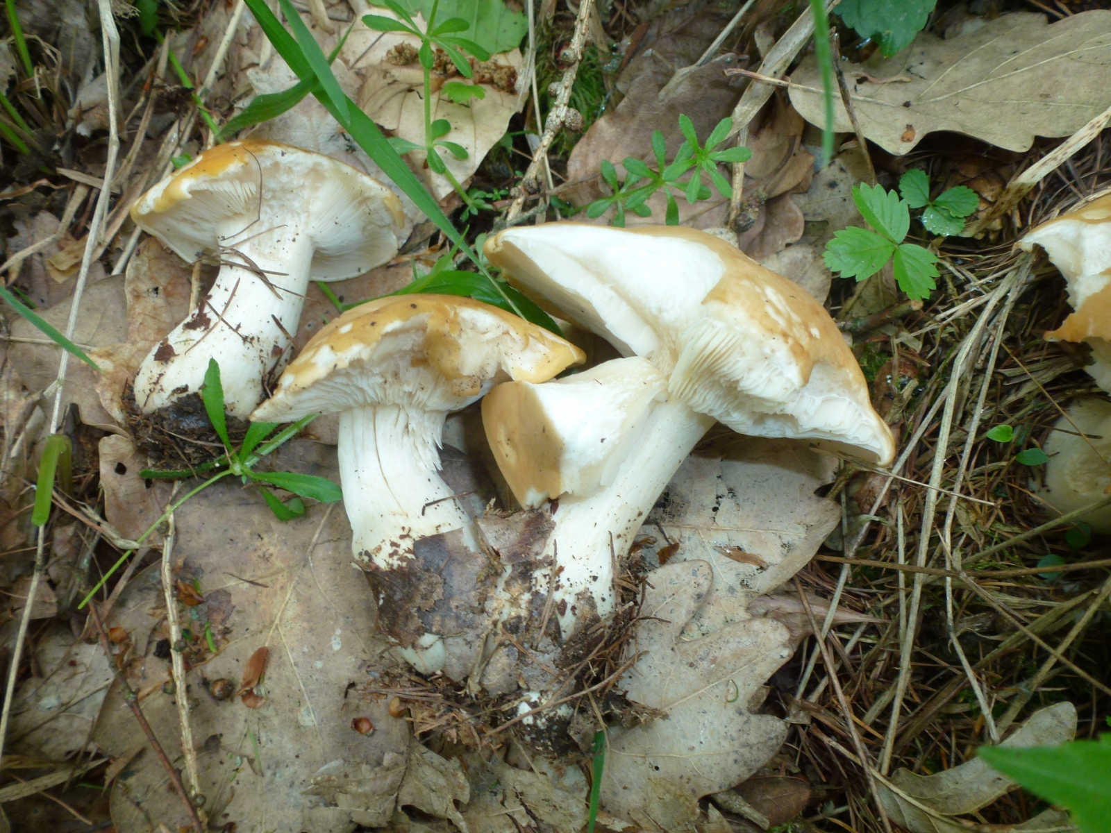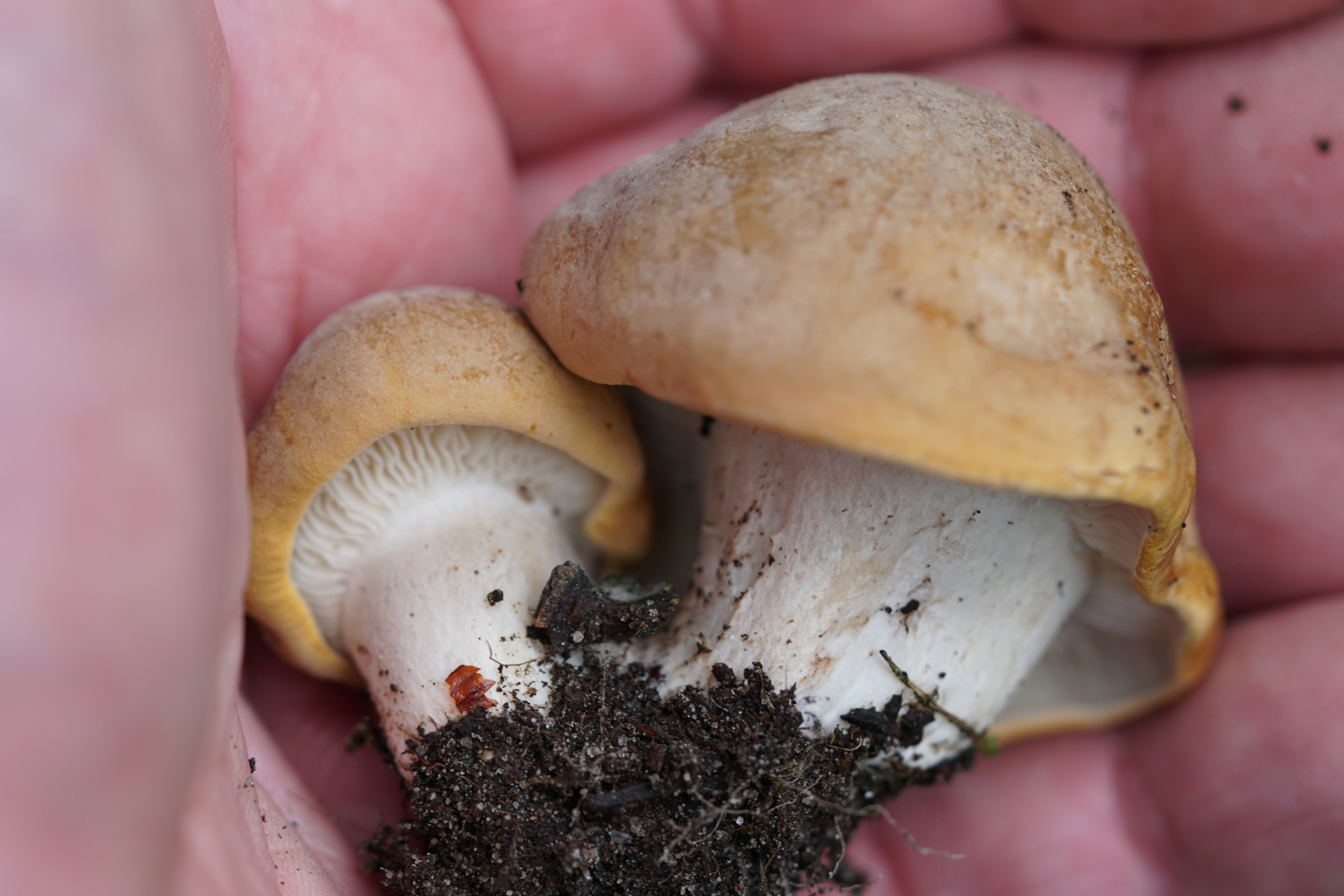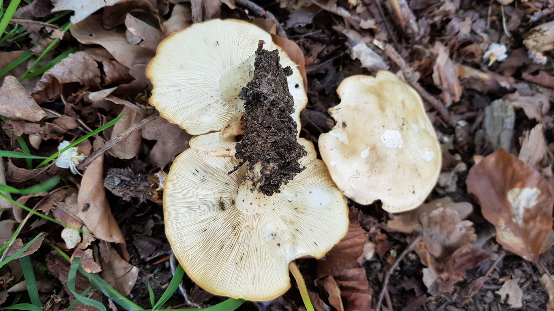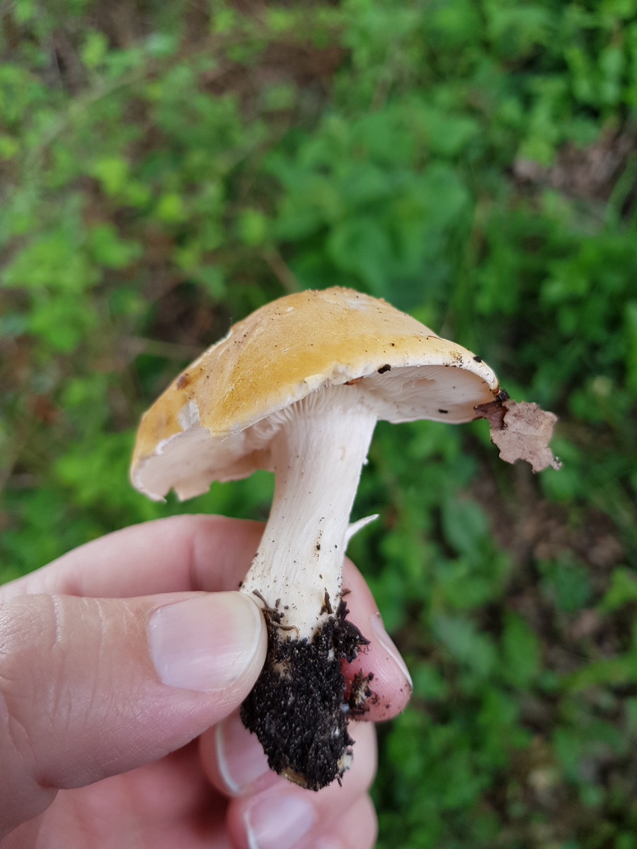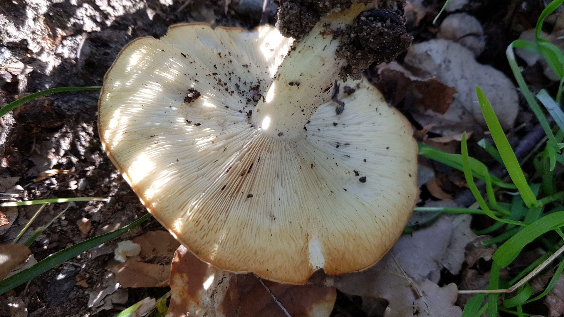 Farbe: Ockerig-gelber Hut, Lamellen cremeweiß, Stiel cremeweiß
