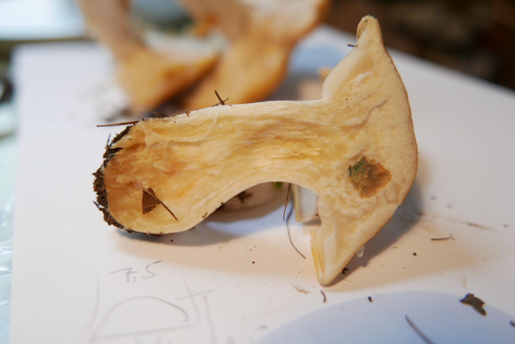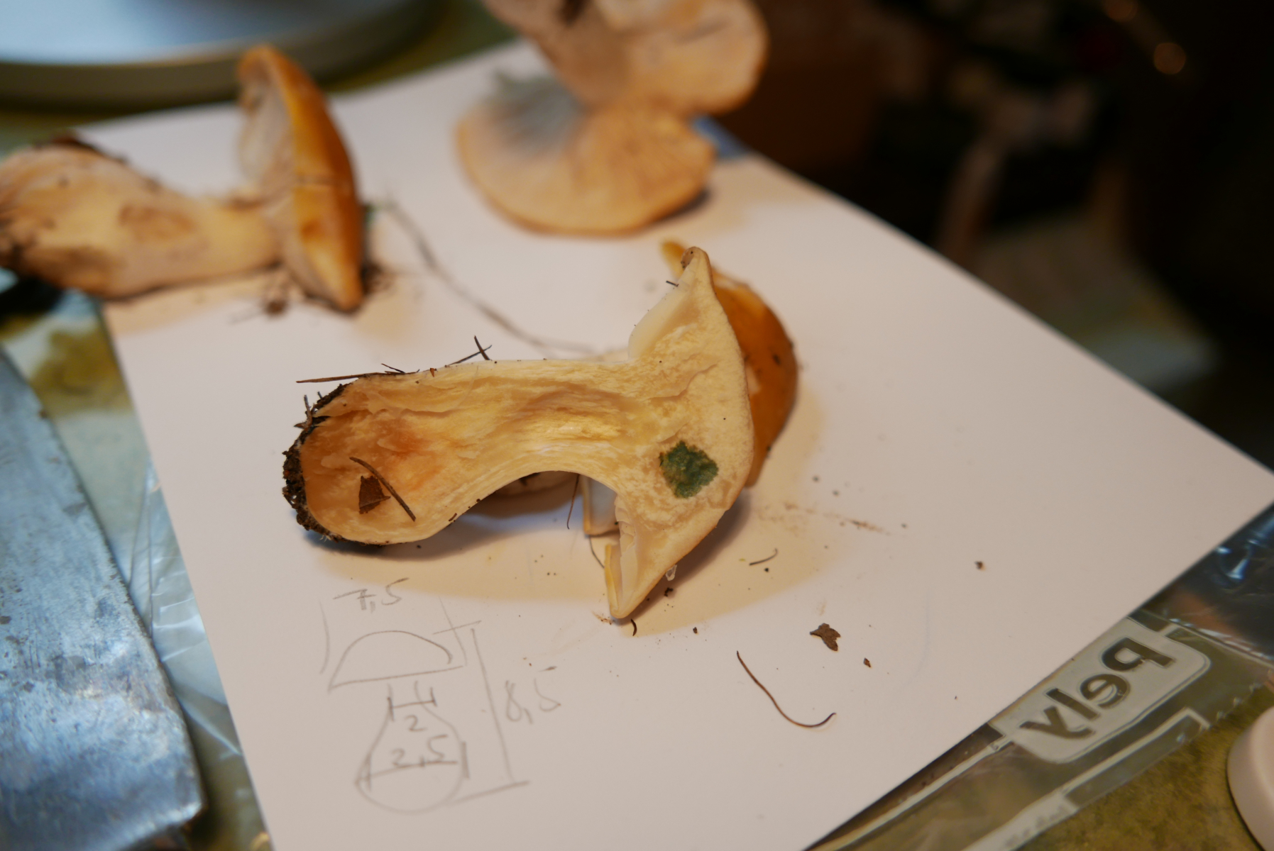 Die ausgerupften Exemplare habe ich mitgenommen, um an ihnen mal ein bisschen mein Mikroskop auszuprobieren. Aber an diesem Pilz bin ich kläglich gescheitert.