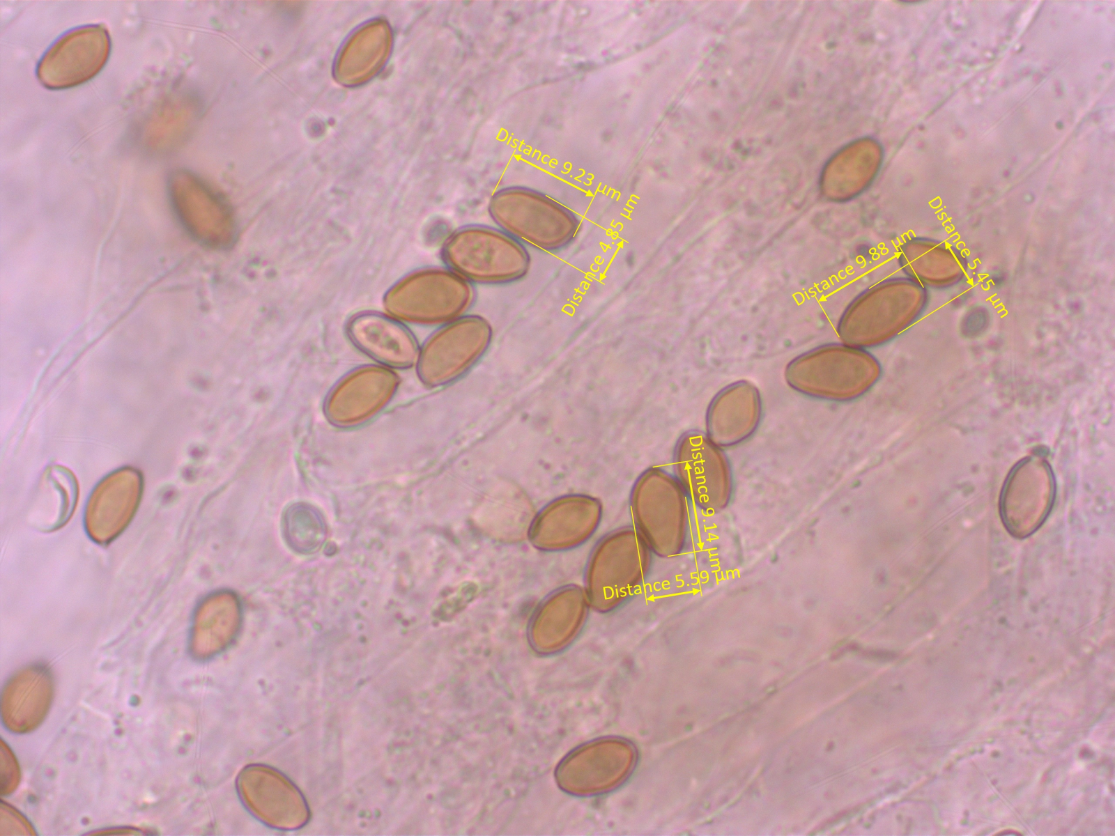 Ich habe nicht sonderlich viele Sporen gemessen, aber sie scheinen mit 8-10x5-5.5 µm zwischen deinen Kollektionen zu liegen.