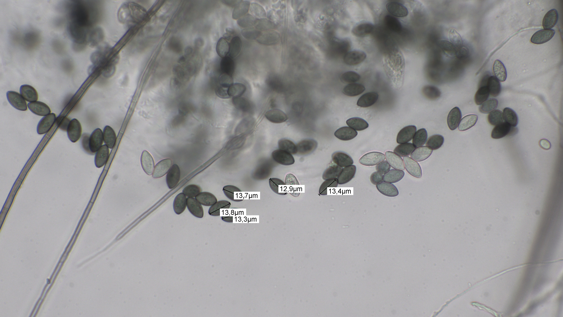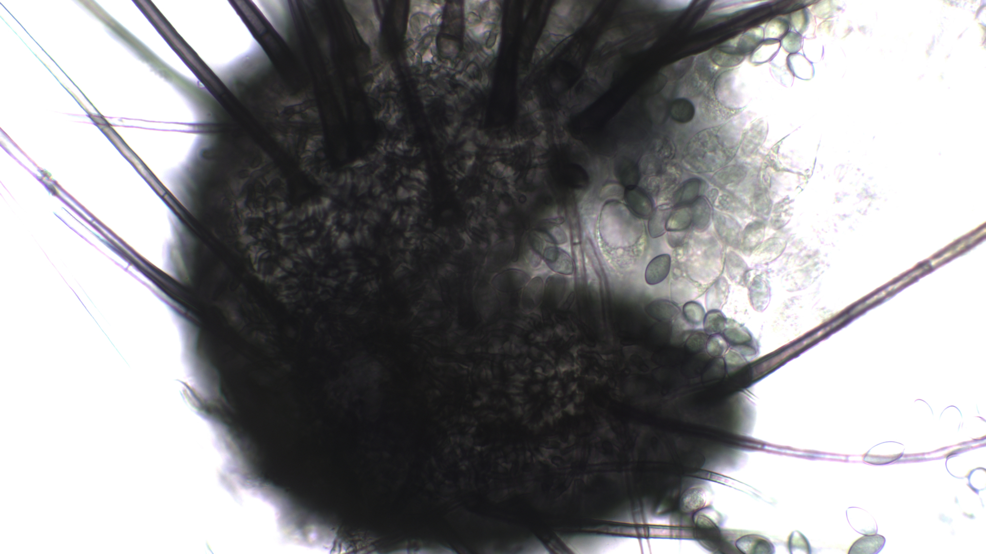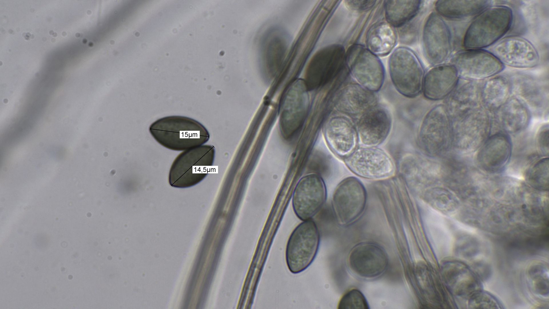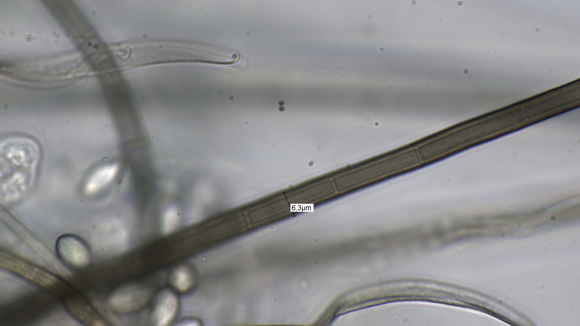 Hab mir noch mal ein paar Fruchtkörper vorgenommen- sie sind definitiv rund haben ringsum Haare, Sporenbreite hab ich auch noch gemessen. Fotos der Wand sind dabei, sind die cephalothecoid? (und richtigrum geschrieben?