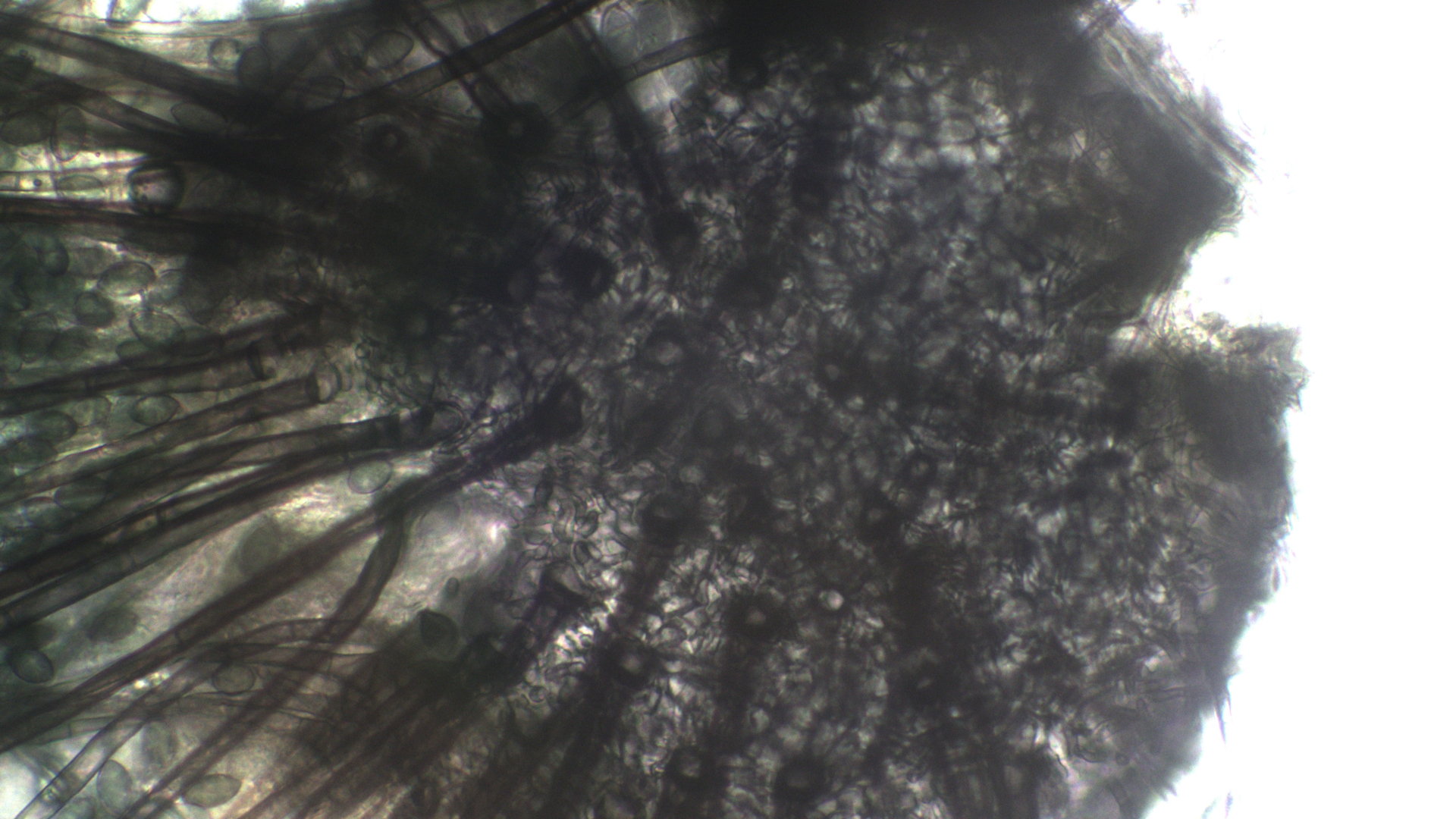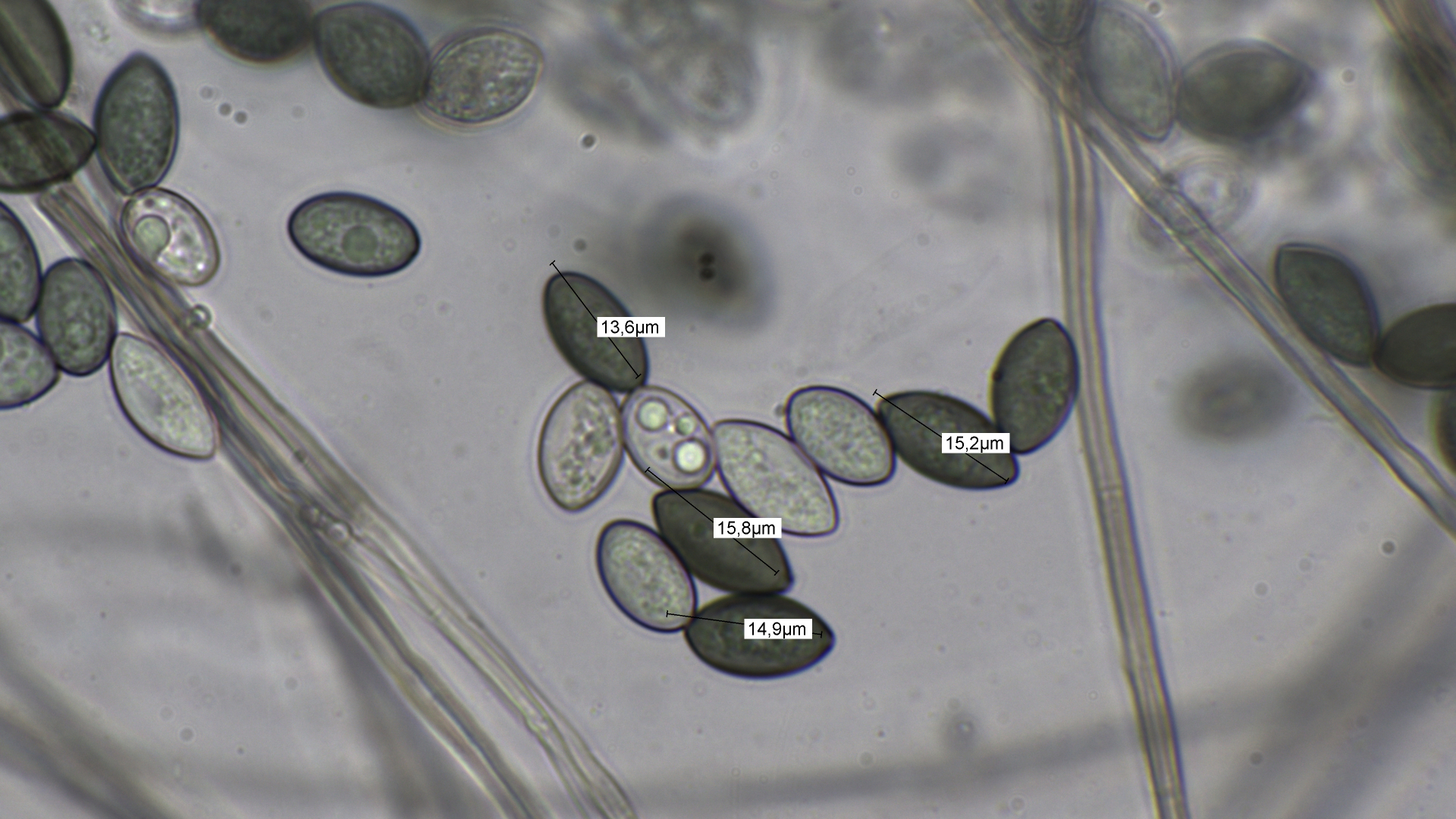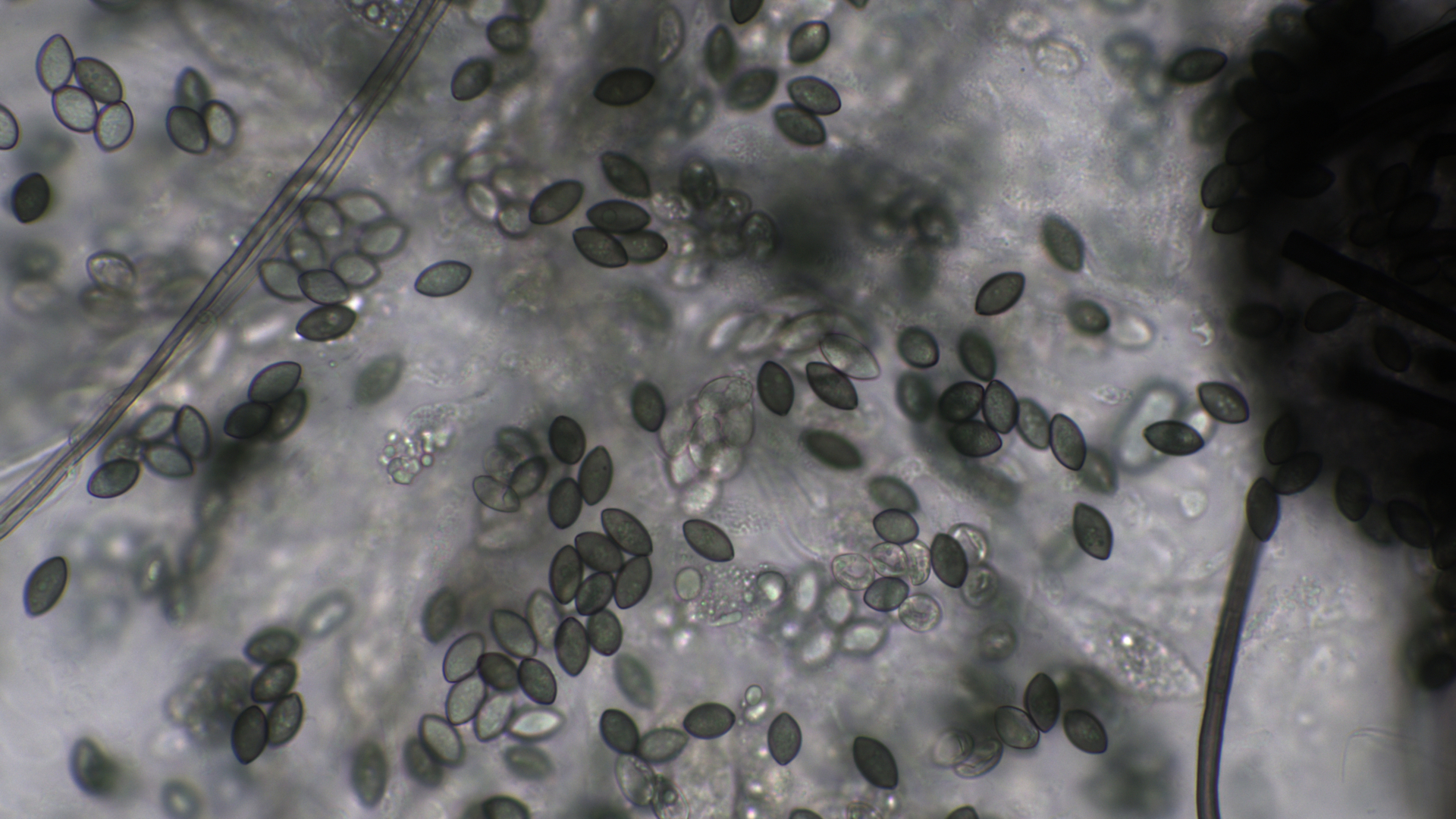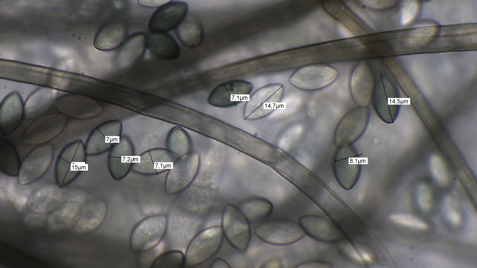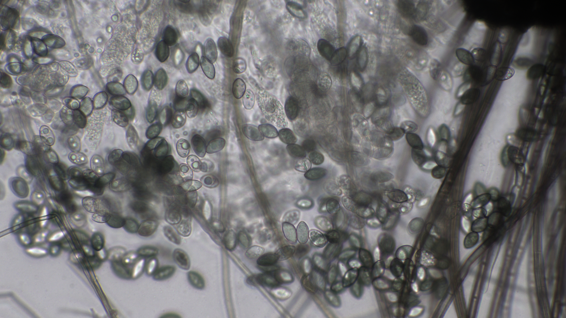 Hab mir noch mal ein paar Fruchtkörper vorgenommen- sie sind definitiv rund haben ringsum Haare, Sporenbreite hab ich auch noch gemessen. Fotos der Wand sind dabei, sind die cephalothecoid? (und richtigrum geschrieben?