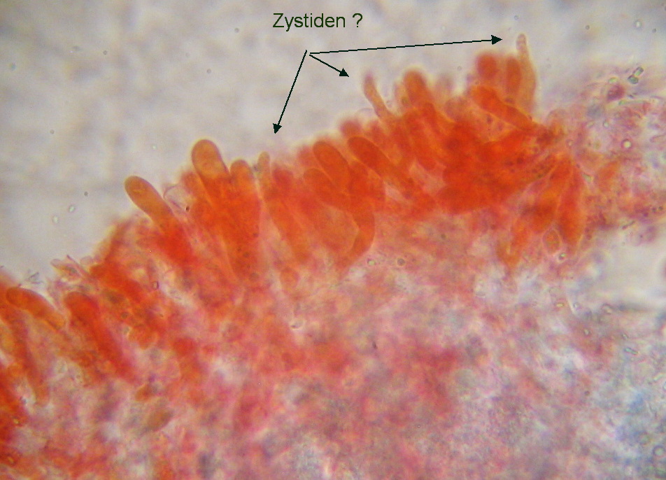 Im Hymenium befinden sich einzelne längere Elemente mit apikal verjüngtem Ende, 30-45µ lang hier geh ich mal von Zystiden aus.