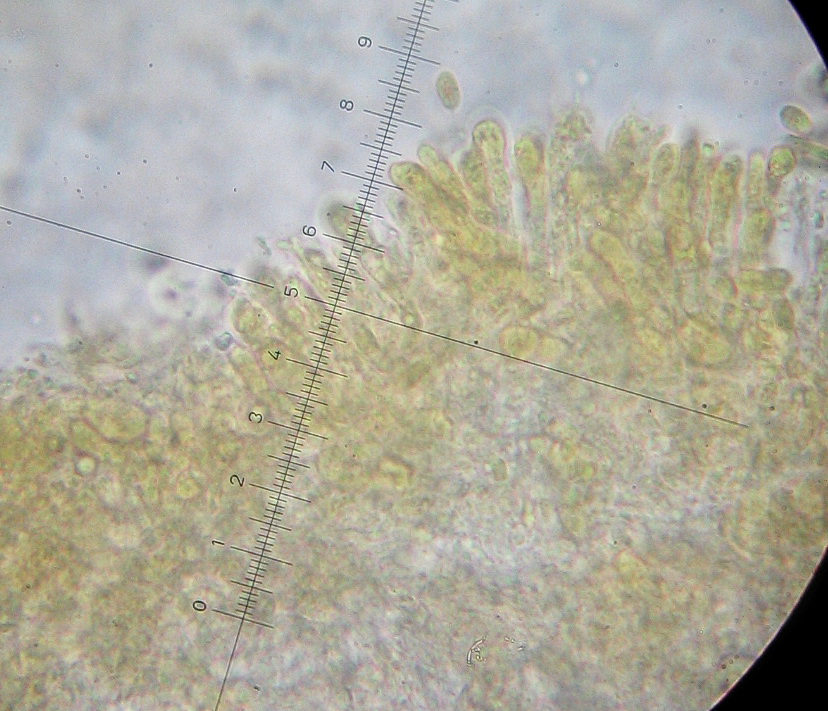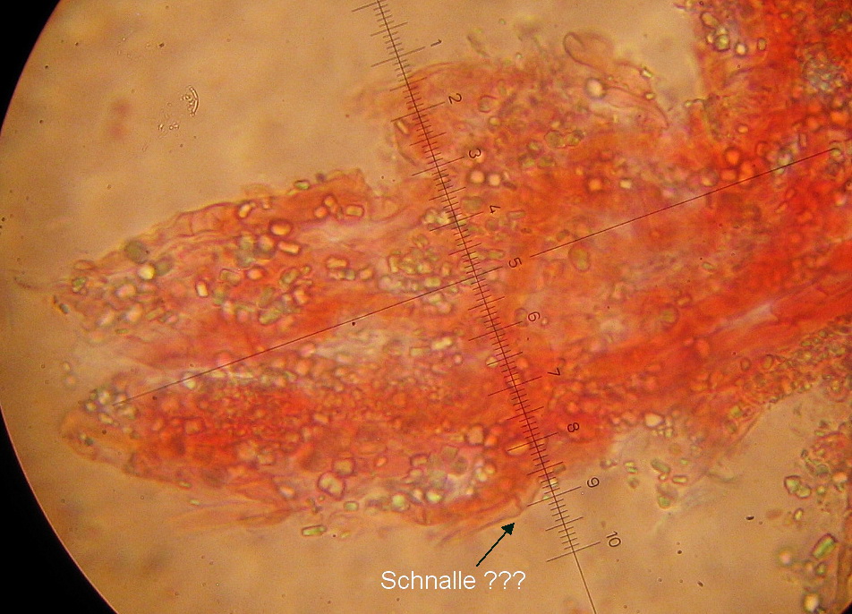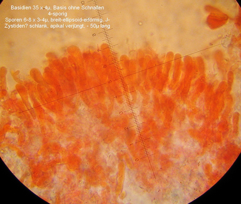 Im Hymenium befinden sich einzelne längere Elemente mit apikal verjüngtem Ende, 30-45µ lang hier geh ich mal von Zystiden aus.