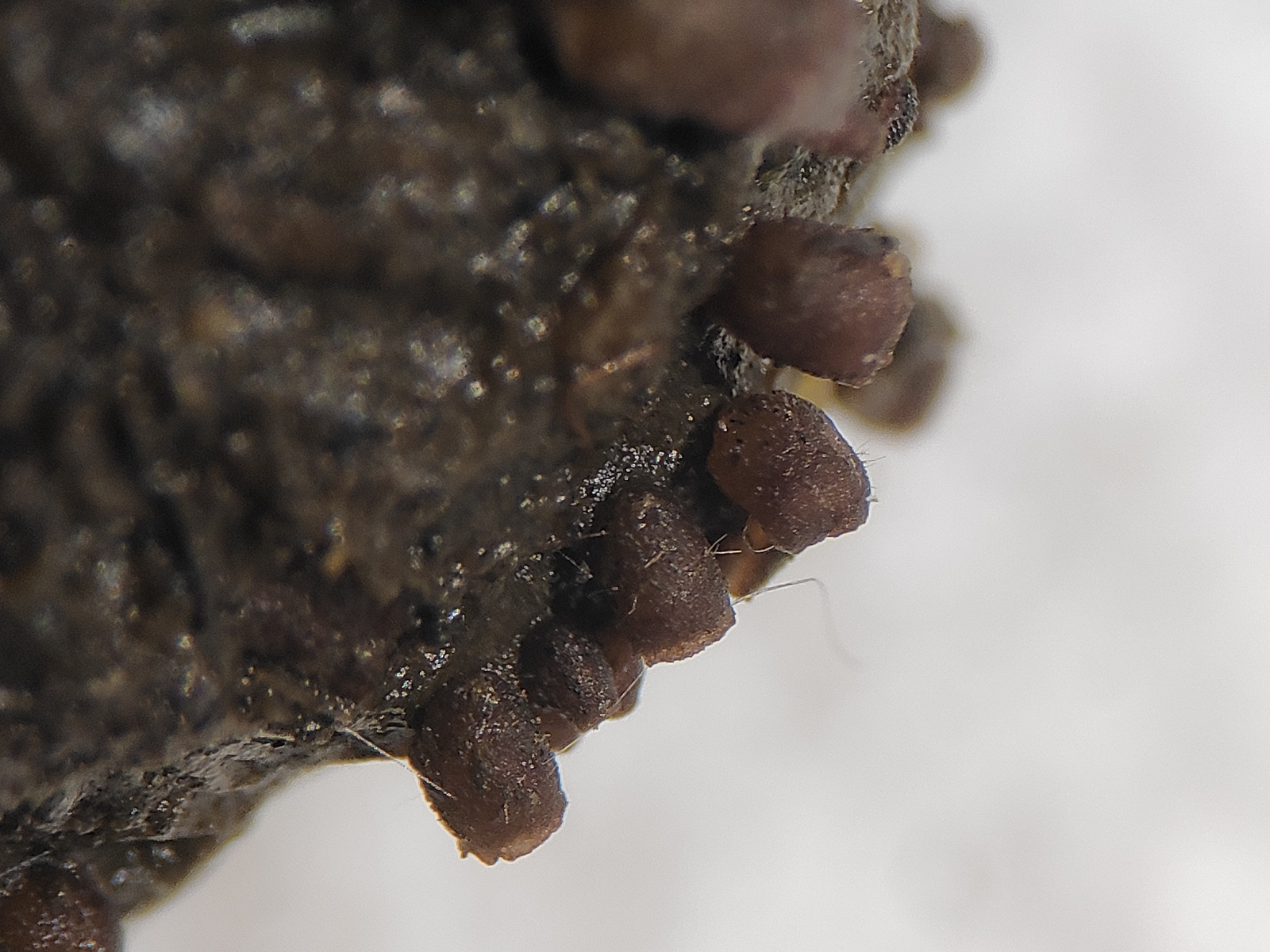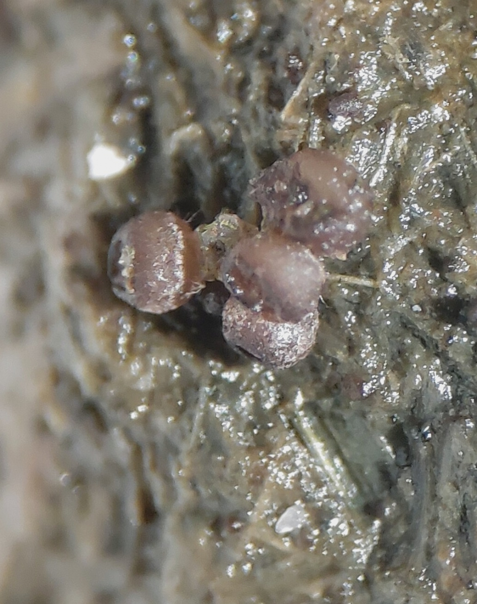 - Apothecien lange tönnchenförmig, später dann Becherförmig. Apothecien bis zu 2 mm im Durchmesser, rotbraun mit einem Hauch Lila gefärbt. Rand etwas dunkler abgesetzt mit verklebten Hyphenbüscheln