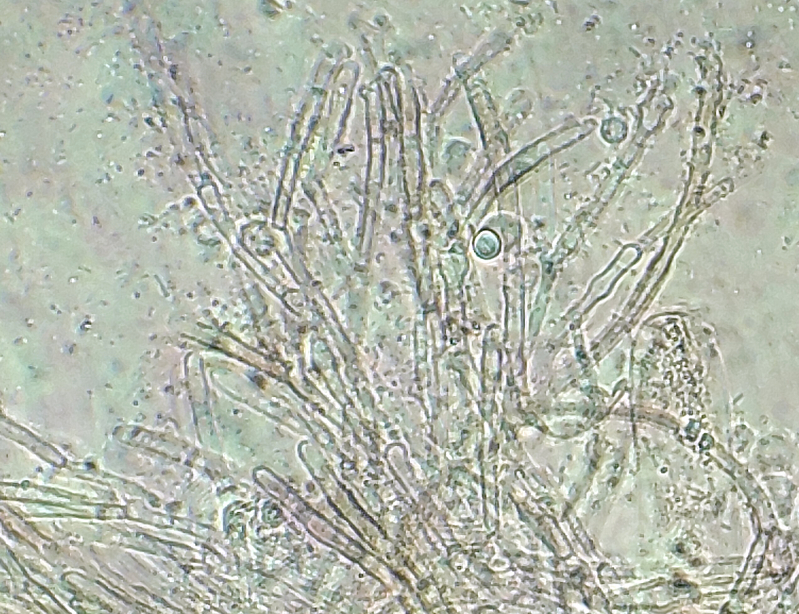 - Sporen breitelliptisch, 20 - 21 x 12,5 - 14,2 µm. Zellkern deutlich erkennbar. Die Außenhülle scheint sich leicht abzulösen