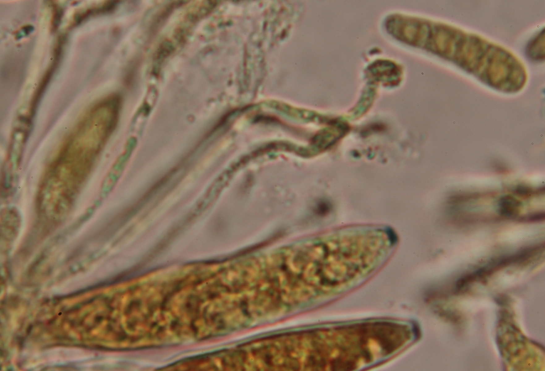Die Paraphysen sind fädig dünn, teils apikal gewunden und mit glasigen Auflagerungen versehen