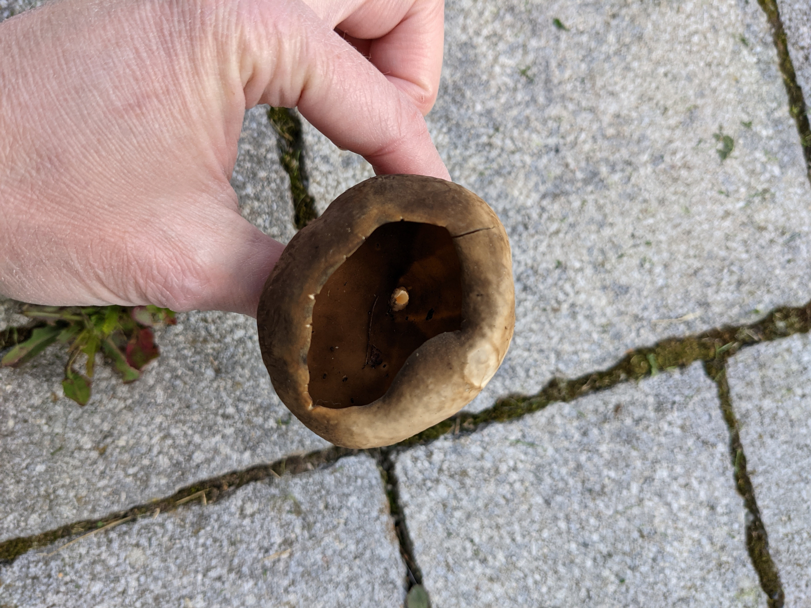 Fundort: Garten, in einem Hexenring wachsend, sehr fester zäher Stil, mehrfach verwendbar. Entfernt stehende Lamellen.