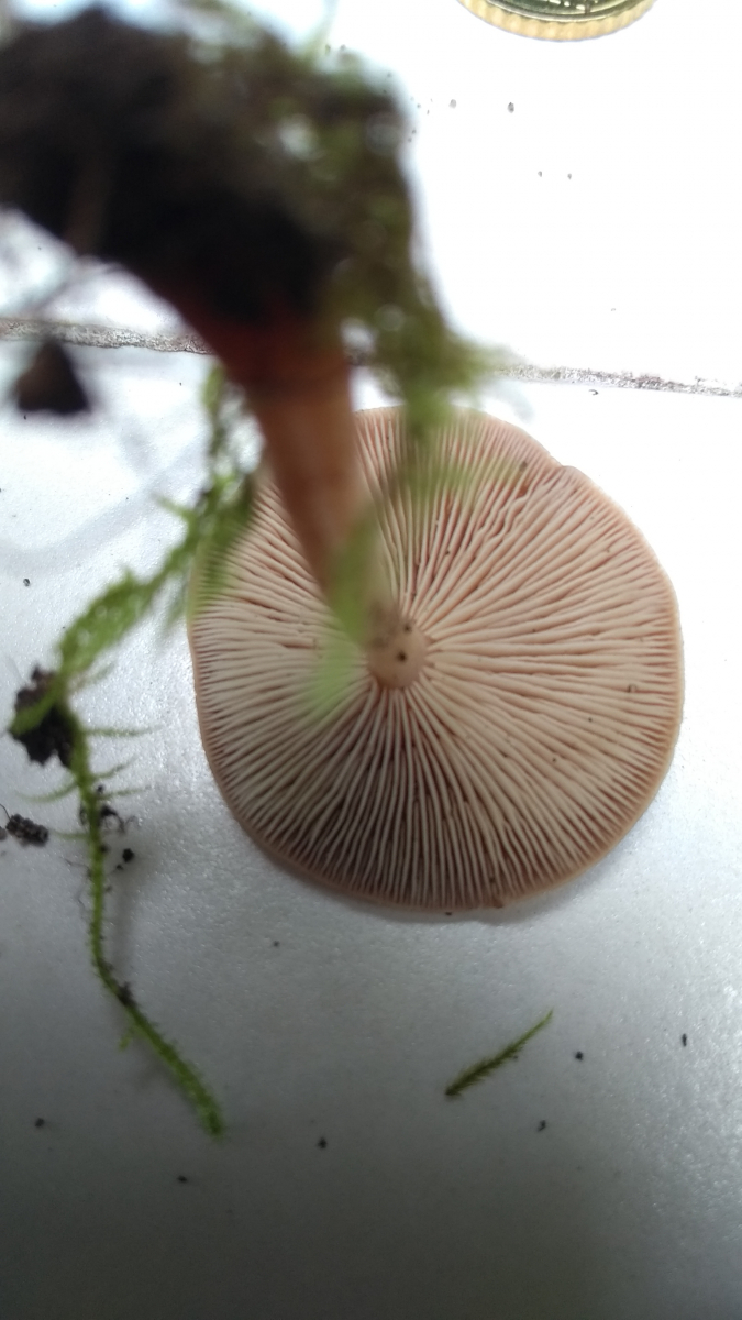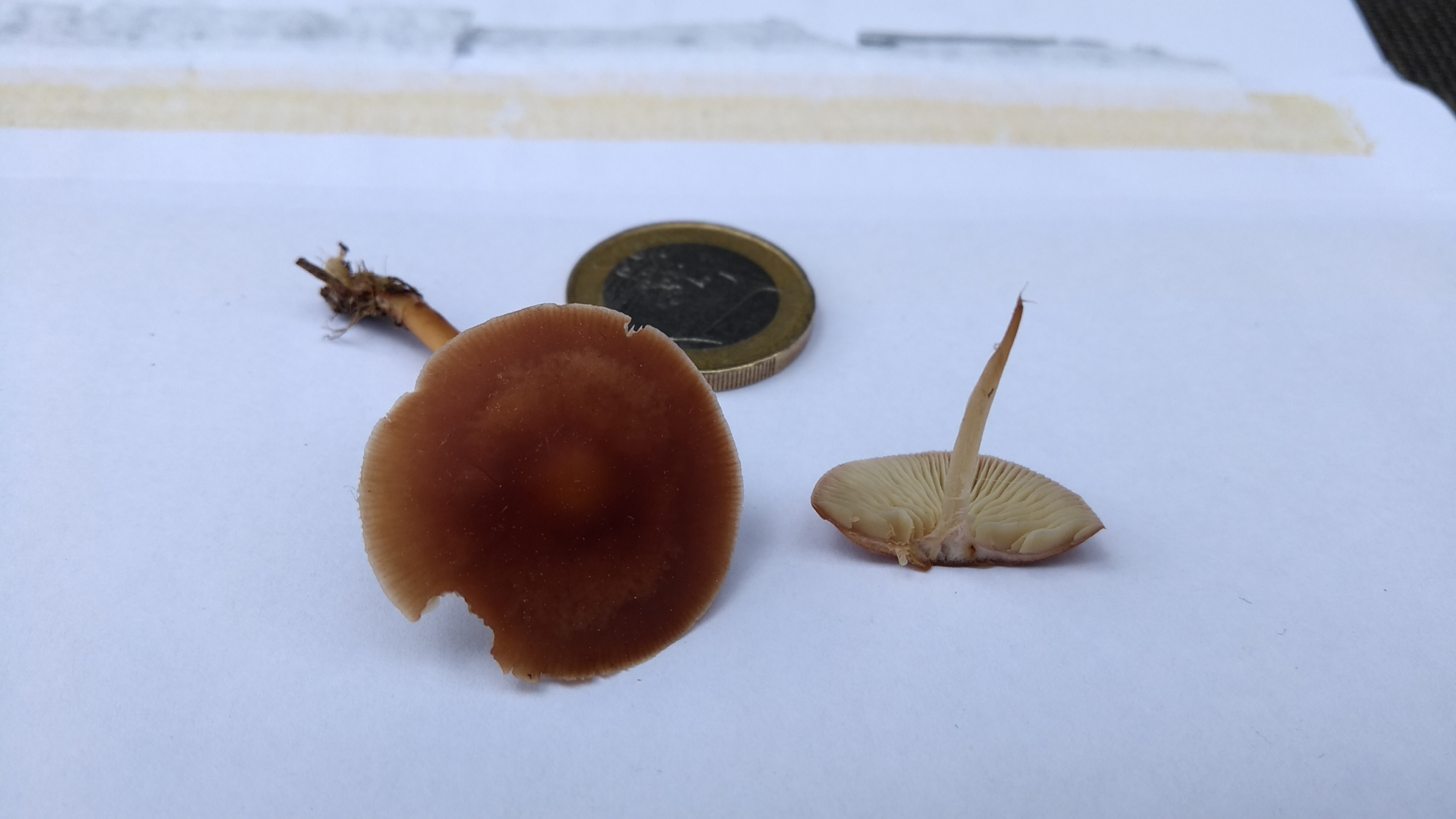 Z.T sind die Hüte hygrophan, zunächst eher kastanienbraun mit stets hellem Rand. Später sind sie etwas ausgeblichener. Einen expliziten Buckel konnte ich nicht finden. Die Lamellen stehen recht eng und sehen die mich angewachsen aus. Der Hut lässt sich nur äußerst schwer vom Stiel trennen.