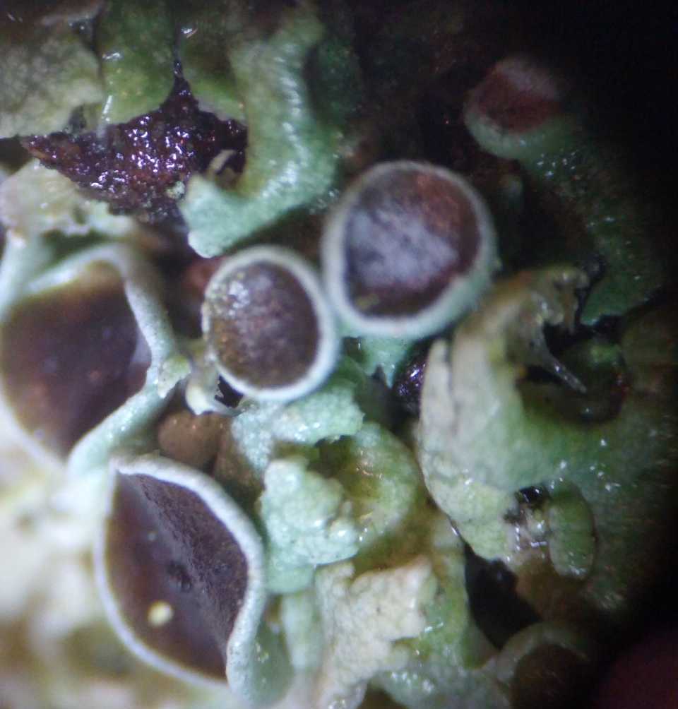 ... upper surface pruinose, dull whitish when dry, greenish when moist (or turning green when sprayed with water - rather specific trait. Apothecia usually numerous, more or less clustered towards the center, cup-shaped, sessile, 1-1.25 mm diam., disc concave to flat, pruinose to powdery, grey, grey-brown, grey-blue, grey-purple, exciple concolourous, smooth to convoluted ...