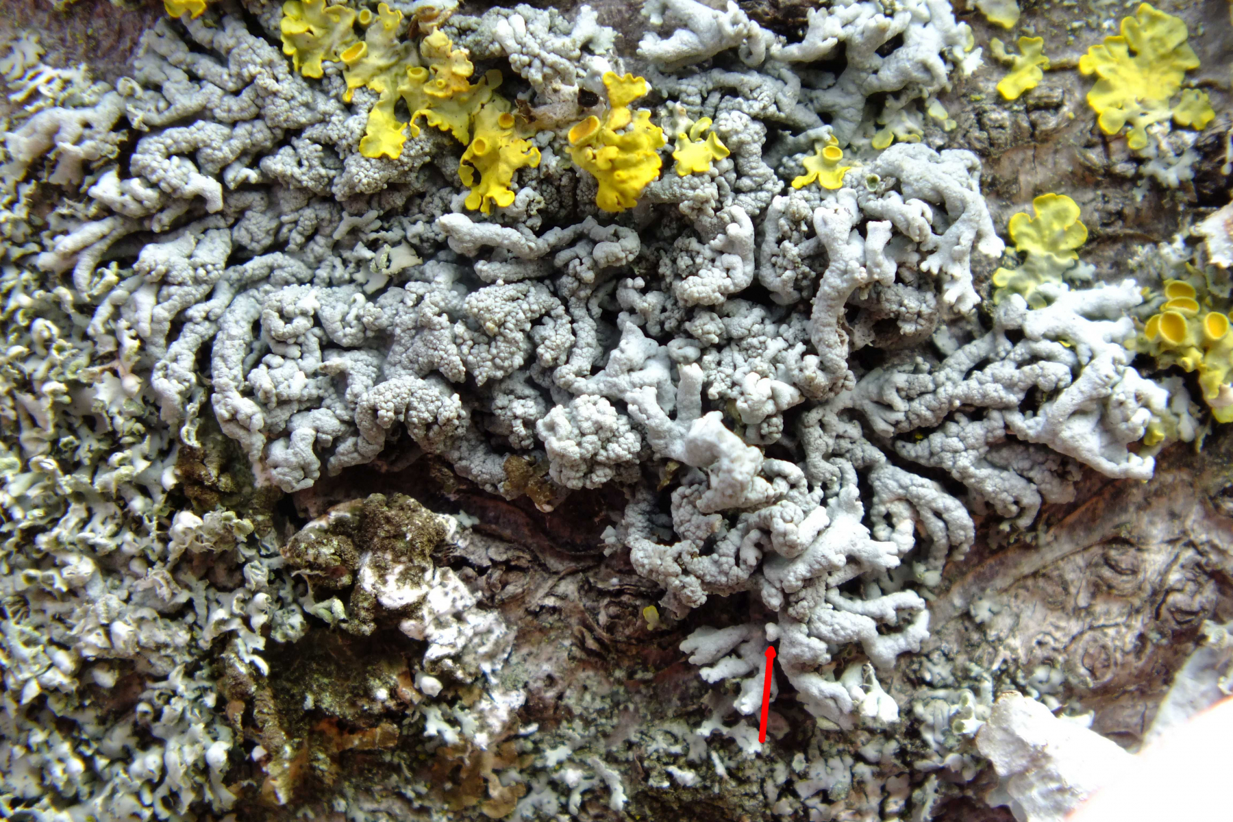 Eine sehr ähnliche, gekräuselte Thallusstruktur, wie in Bild 4, habe ich bisher nur ein weiteres Mal beobachtet (Bild 5). Die Flechte am Baumstamm in Bild 5 besitzt allerdings lediglich eine, ganz winzige Apothecie (roter Pfeil):