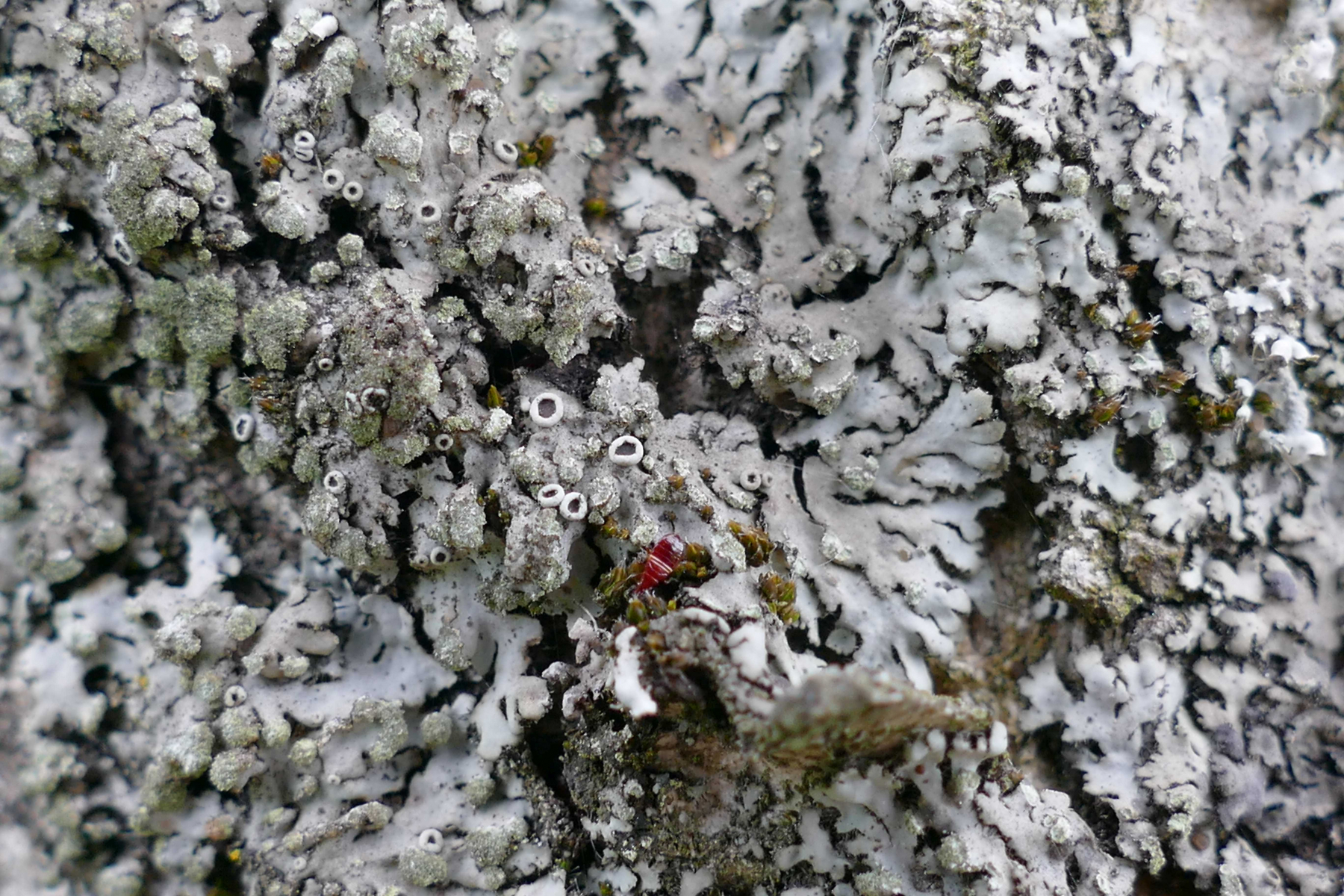 Anders sieht die Flechte in Bild 4 aus. Die Apothecien der Flechte in Bild 4 (am Baumstamm wachsend) sind vollständig weiß bereift, die Randlappen überlappen sich gegenseitig, der Thallus ist im Zentrum sehr stark "gekräuselt". Ich vermute, es handelt sich definitiv um eine andere Flechte als in den vorherigen Aufnahmen, also nicht um P.aipolia. P.stellaris besitzt m.W. aber eher unbereifte Apothecien und scheidet somit vermutlich aus, obwohl die dichte Anordnung der Lappen zu P.stellaris passen könnte... Nun?