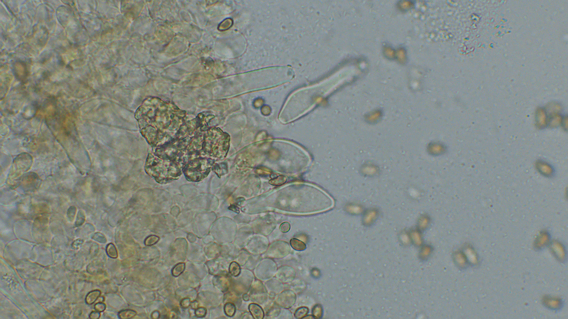 Das Zentrum des Pilzhutes war noch dunkler, als es jetzt auf den Fotos den Anschein hat. Der Stiel war an der Basis verdickt. Kaulozystiden waren im oberen Stielbereich zahlreich, im unteren nur etwas verkümmert an einer Stelle.