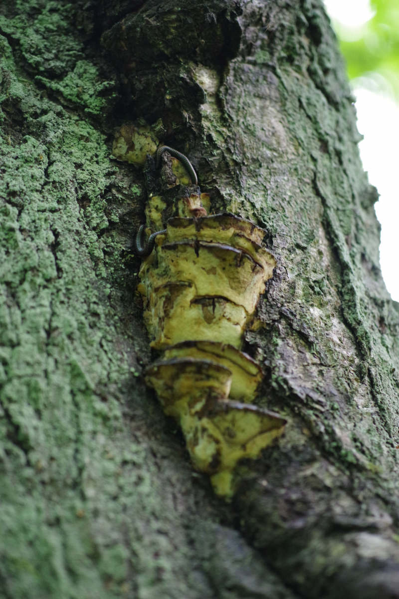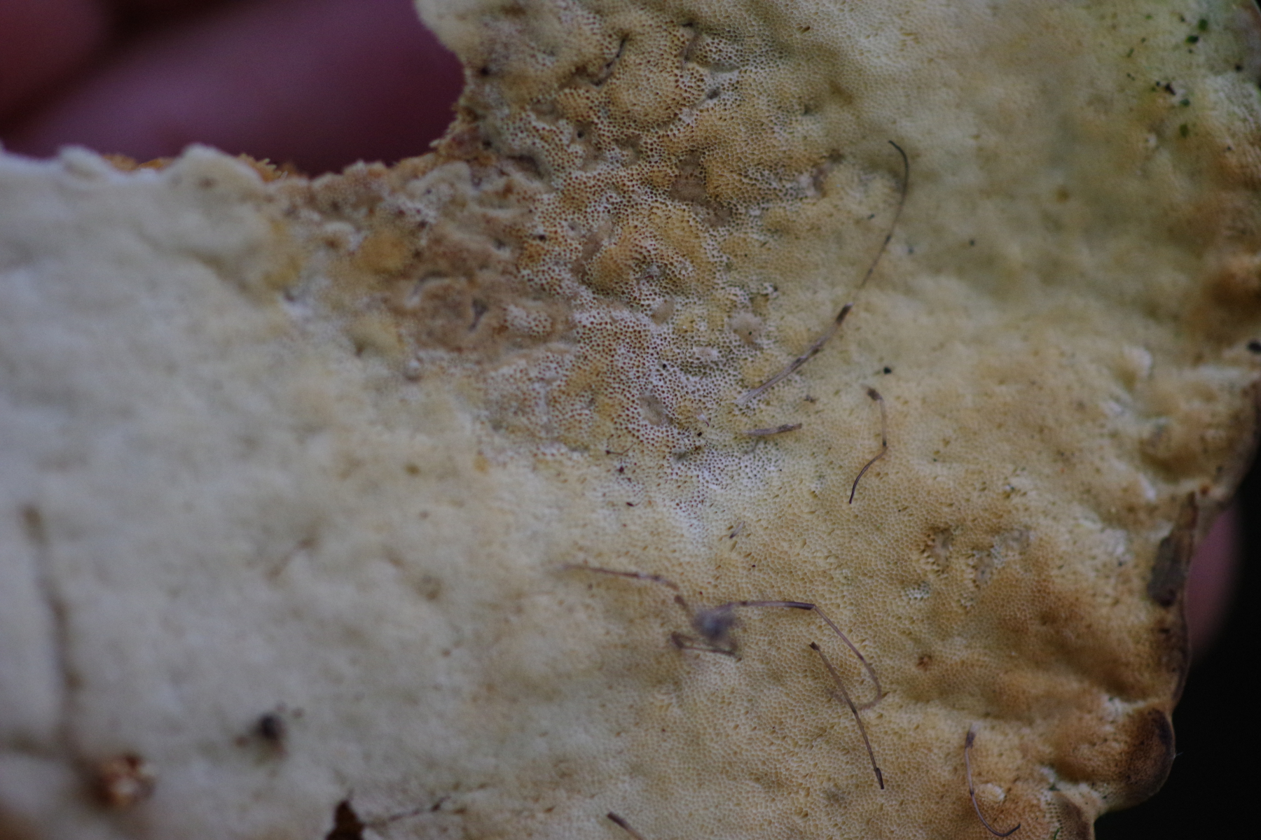 wieder in den Kerbtalwäldern an der Dubysa, laut Forstkataster ist das Birkenwald, Alter 100. Was gut hinkommen kann, wobei einige Fichten und Birken sicher älter sind. An einer alten Birke, lebend, aber mit grünen Ästen nur sehr weit oben, habe ich einen Porling gefunden, mit dem ich nichts anfangen kann. Überwiegend konsolenartig übereinander, teilweise 2 cm, die größeren aber mindestens 8 cm vorspringen. Mit ausgeprägter "scharfer" Kante. Deutlich geschichtet, mit bereits wieder einsetzendem Wachstum. Sehr kleine Poren, etwa 5 je mm. Geruch schwach, unauffällig. Keine Reaktion auf KOH. Beleg habe ich mitgenommen, ist ja vielleicht wieder was interessantes.