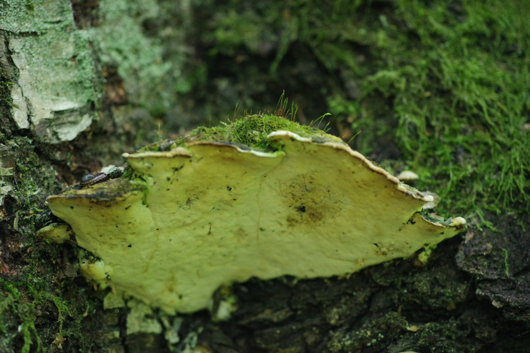 wieder in den Kerbtalwäldern an der Dubysa, laut Forstkataster ist das Birkenwald, Alter 100. Was gut hinkommen kann, wobei einige Fichten und Birken sicher älter sind. An einer alten Birke, lebend, aber mit grünen Ästen nur sehr weit oben, habe ich einen Porling gefunden, mit dem ich nichts anfangen kann. Überwiegend konsolenartig übereinander, teilweise 2 cm, die größeren aber mindestens 8 cm vorspringen. Mit ausgeprägter "scharfer" Kante. Deutlich geschichtet, mit bereits wieder einsetzendem Wachstum. Sehr kleine Poren, etwa 5 je mm. Geruch schwach, unauffällig. Keine Reaktion auf KOH. Beleg habe ich mitgenommen, ist ja vielleicht wieder was interessantes.