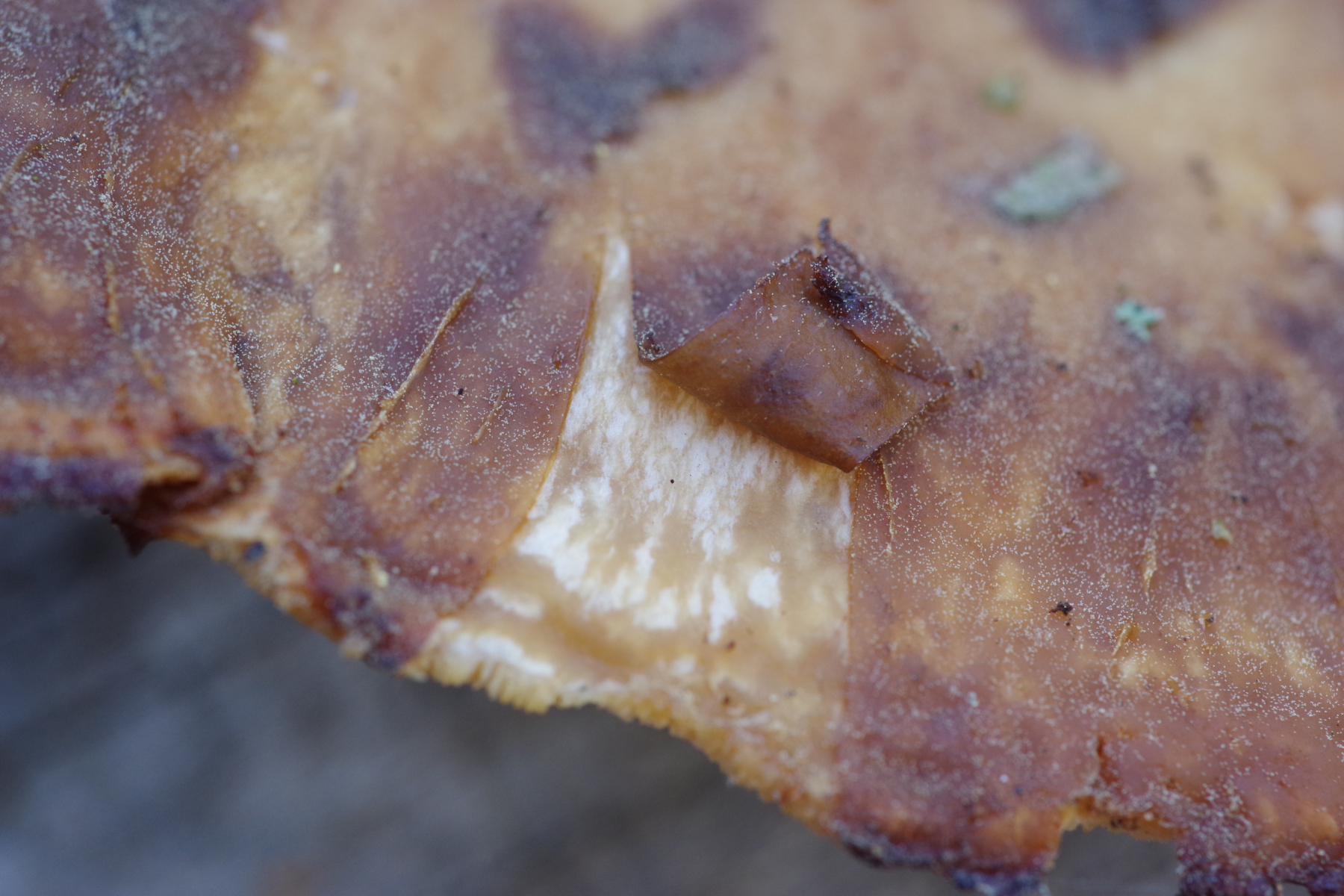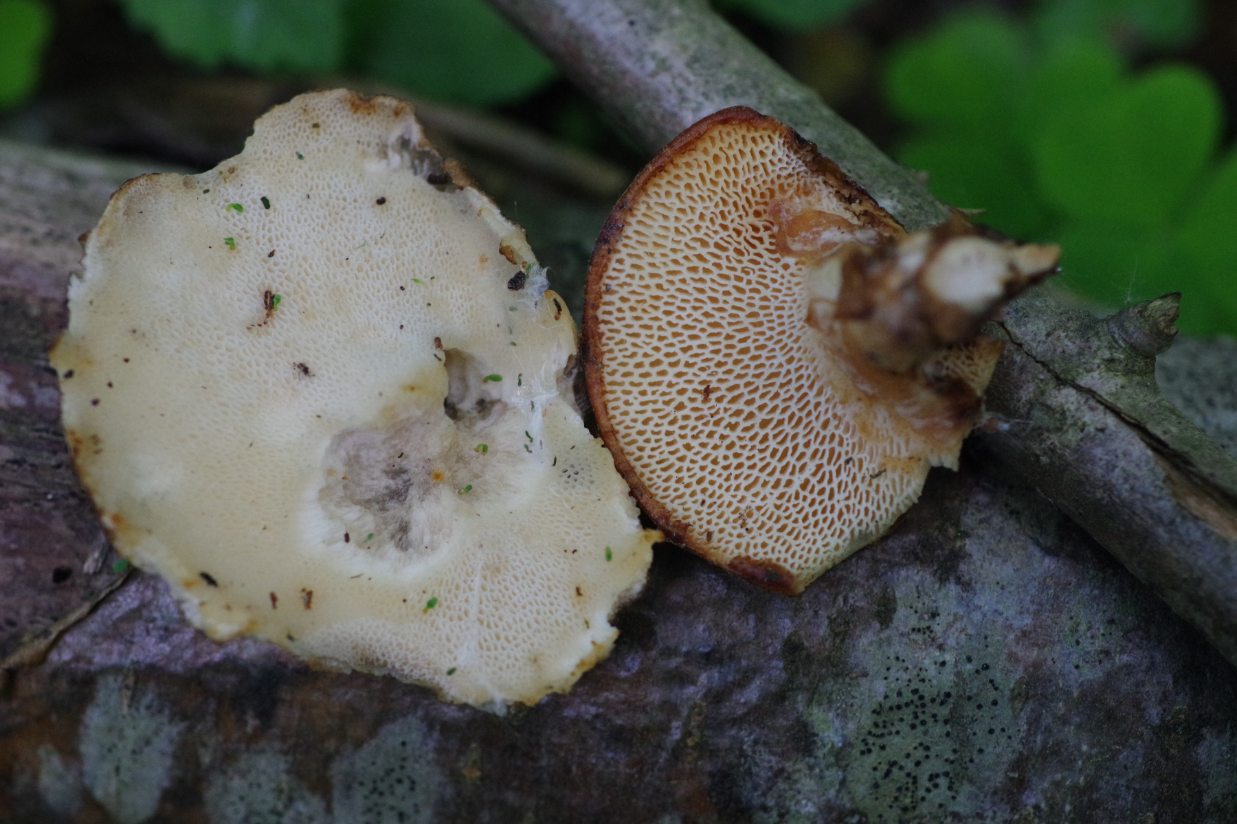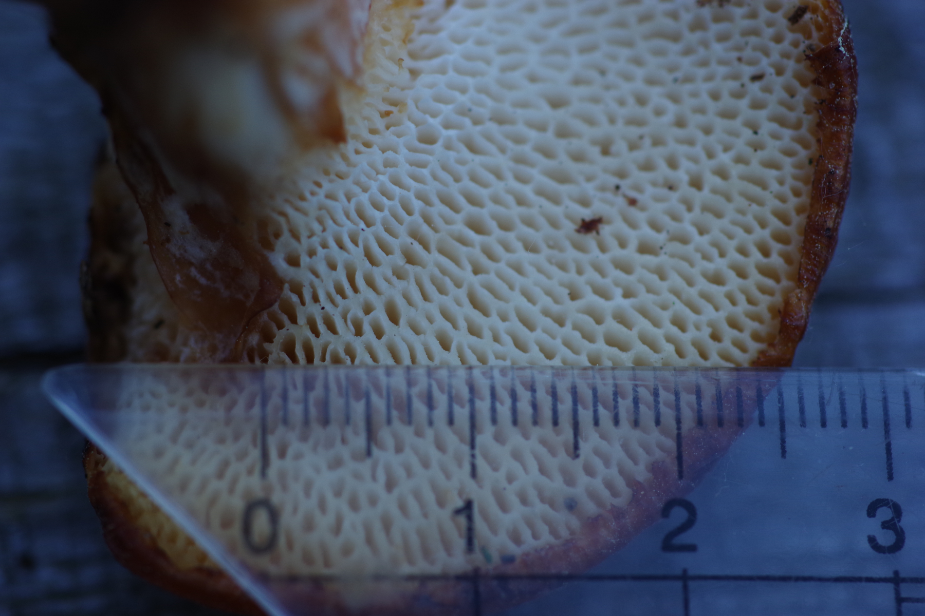 So ganz will mir keine der beiden Optionen gefallen. Das heißt, ioch würde gerne den Stieljoker ziehen, um mehr vom Gesamthabitus des Fruchtkörpers zu erfahren. Und ob Stielbasis irgendwie abweichend gefärbt, wie lang der Stiel im Verhältnis zur Hutbreite, ob eher zentral oder eher seitlich und wie die Poren am Stiel auslaufen.