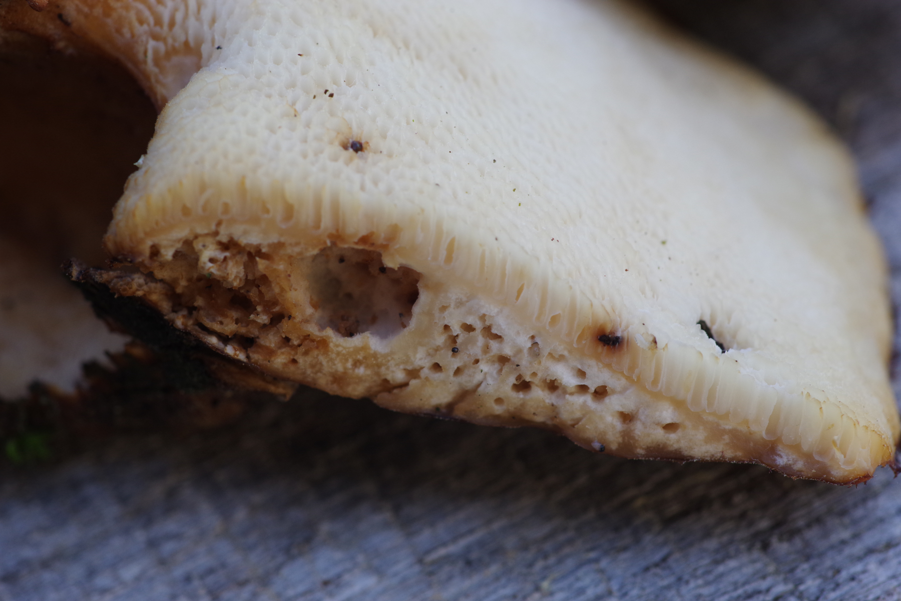 Dann war ich noch bei dem anderen Pilz, der nicht an auf dem Boden liegendem Substrat wächst. Siehe da, auch der hat riesige Poren. Ist überhaupt ein gewaltiger Schlappen geworden, 16 cm breit, der unter dem Eigengewicht abgefallen ist: