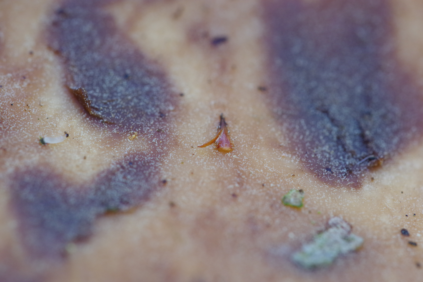 Dann war ich noch bei dem anderen Pilz, der nicht an auf dem Boden liegendem Substrat wächst. Siehe da, auch der hat riesige Poren. Ist überhaupt ein gewaltiger Schlappen geworden, 16 cm breit, der unter dem Eigengewicht abgefallen ist: