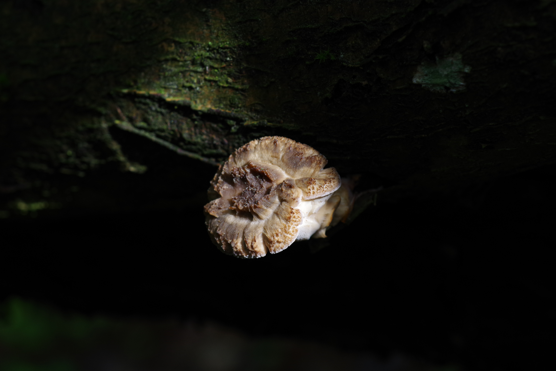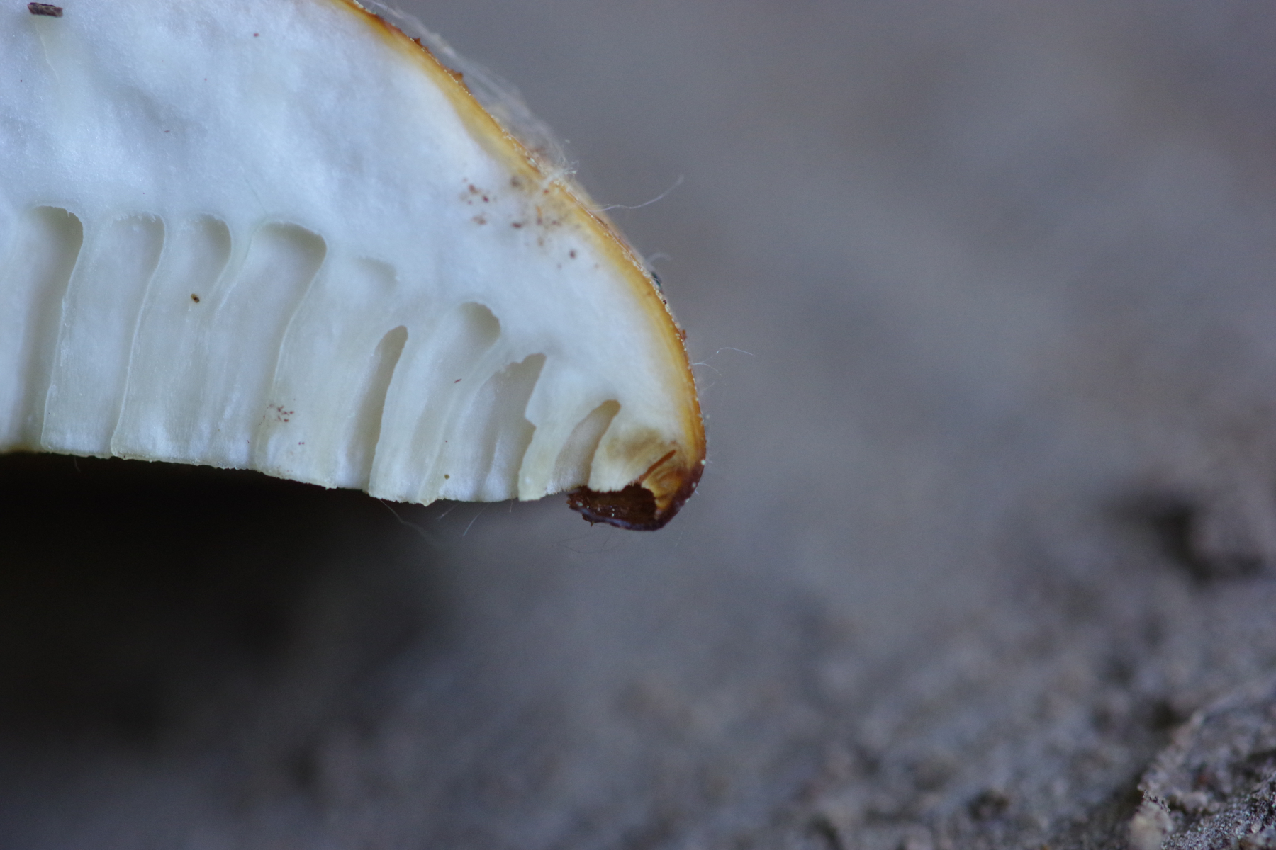 Dann war ich noch bei dem anderen Pilz, der nicht an auf dem Boden liegendem Substrat wächst. Siehe da, auch der hat riesige Poren. Ist überhaupt ein gewaltiger Schlappen geworden, 16 cm breit, der unter dem Eigengewicht abgefallen ist: