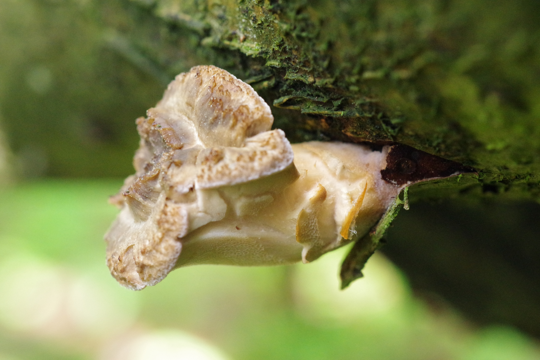 P. alveolaris bildet nach meiner Erfahrung nur kurze Stiele aus, an denen die Poren weit herablaufen, manchmal sogar bis zur Stielbasis. Bei einer solchen Wuchsweise (aus einer Spalte heraus) kann zumindest die Stiellänge aber variieren. Da man aber arcularius hier ohnehin ausschließen kann (viel zu dickfleischig, Hutränder völlig ungewimpert), könnte das tatsächlich in die Richtung gehen, die Frank auch schon vermutet hat: Also ein Polyporus tuberaster, mit einigermaßen ungewöhnlich groben Poren.