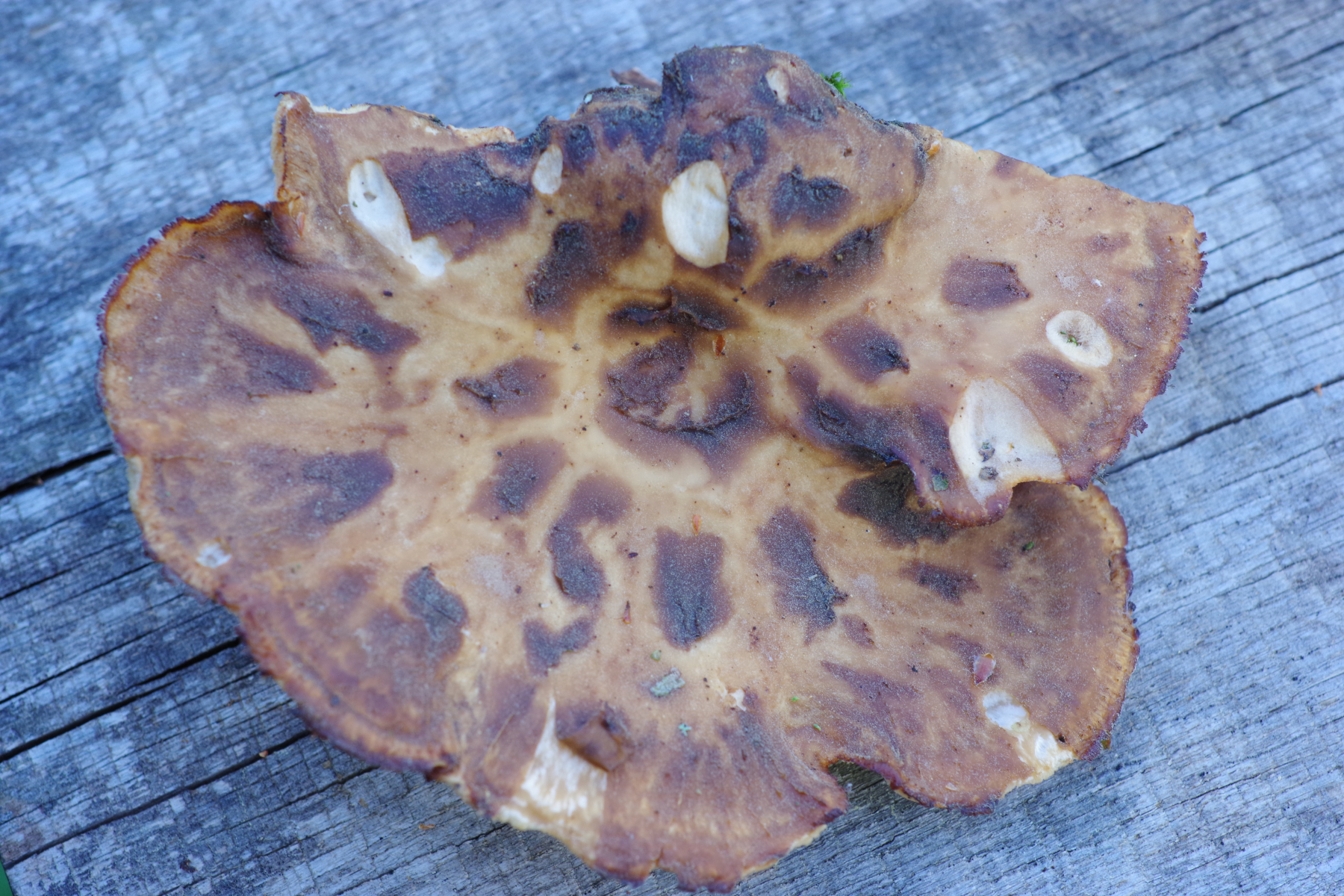 So ganz will mir keine der beiden Optionen gefallen. Das heißt, ioch würde gerne den Stieljoker ziehen, um mehr vom Gesamthabitus des Fruchtkörpers zu erfahren. Und ob Stielbasis irgendwie abweichend gefärbt, wie lang der Stiel im Verhältnis zur Hutbreite, ob eher zentral oder eher seitlich und wie die Poren am Stiel auslaufen.