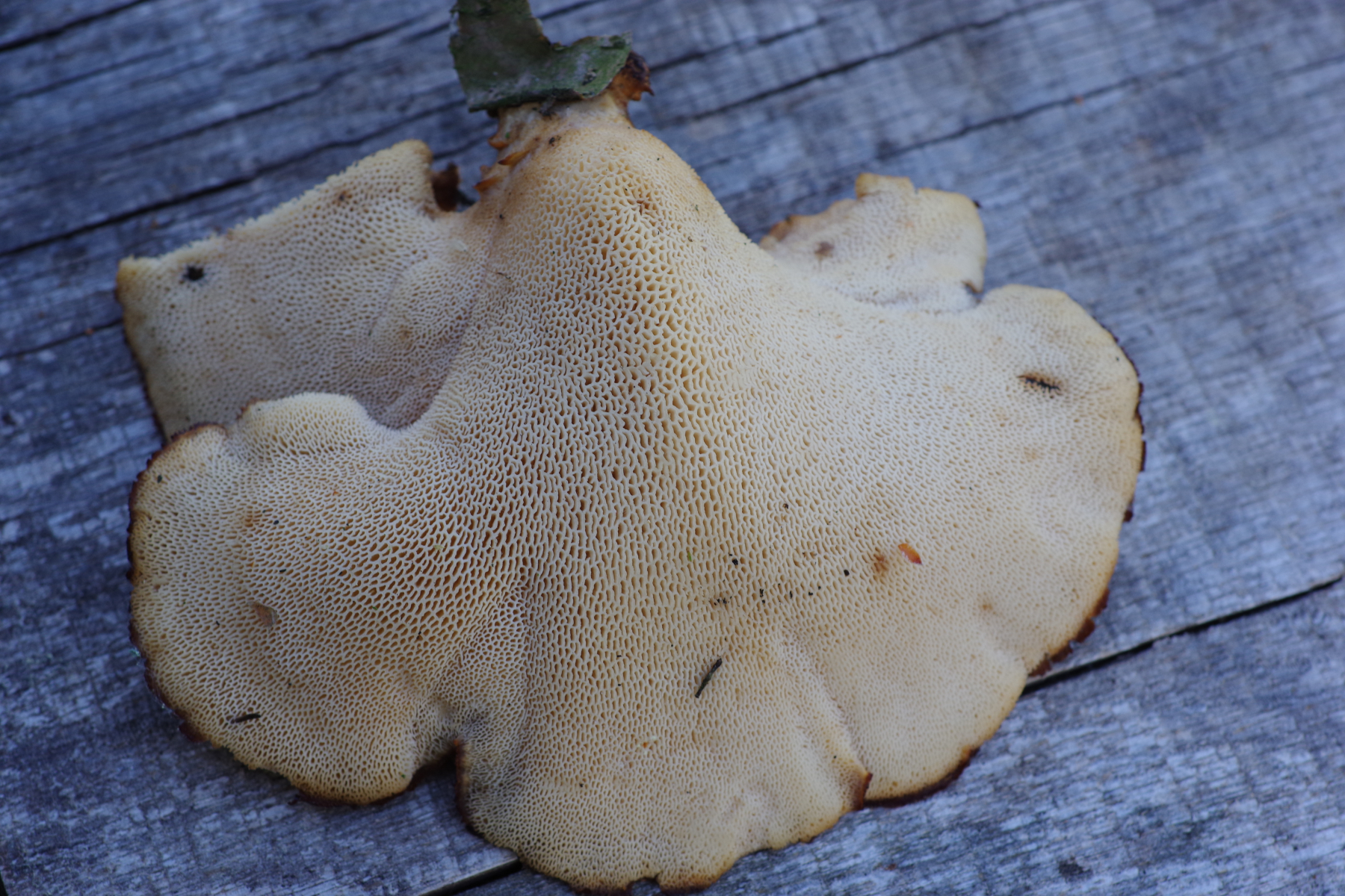 Dann war ich noch bei dem anderen Pilz, der nicht an auf dem Boden liegendem Substrat wächst. Siehe da, auch der hat riesige Poren. Ist überhaupt ein gewaltiger Schlappen geworden, 16 cm breit, der unter dem Eigengewicht abgefallen ist: