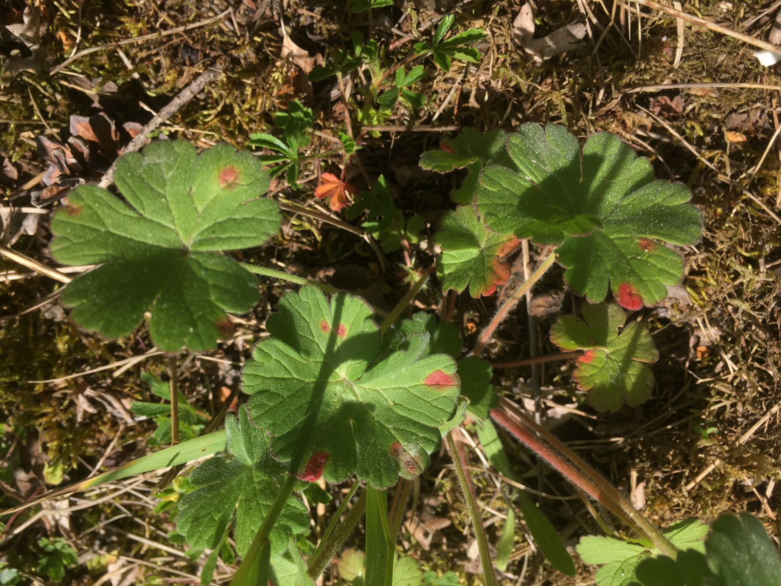C3) Puccinia cf polygoni oder doch Uromyces geranii an Geranium spec. (cf. mollis) oder P. kabatianus (G. pyrenaeicum) auf Trockenrasen. Leider kein Bild der Unterseite und am nächsten Tag war das Blatt welk.