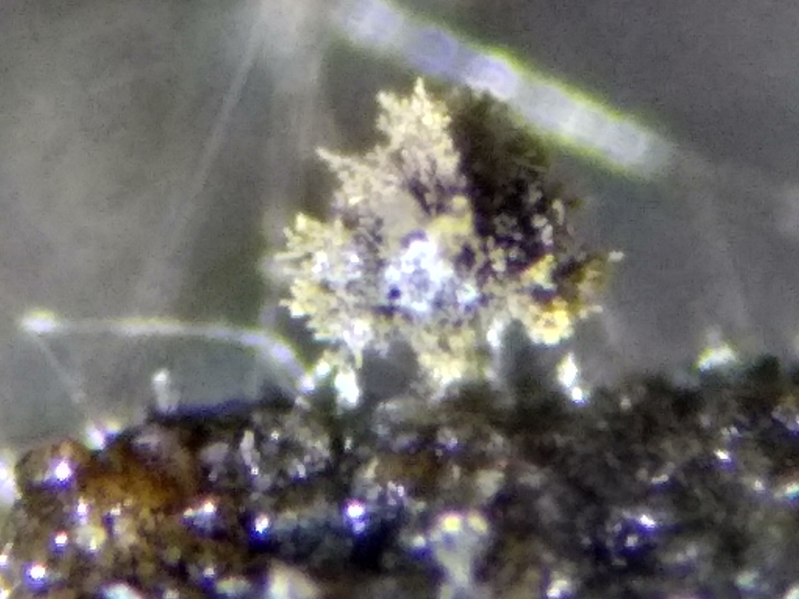 Um halbwegs was auf den Fotos zu erkennen, musste ich am Makroskop die stärkeren Okulare einsetzen, maximal vergrößern und am darübergeschraubten Smartphone nochmal maximal nachvergrößern. Die Fotos sind leider grottenschlecht, weil die Fruchtkörper wirklich winzig sind! Ich hoffe, ich muss mich dafür nicht schämen, ich habe nicht die Ausrüstung wie andere hier. :grotwerd: