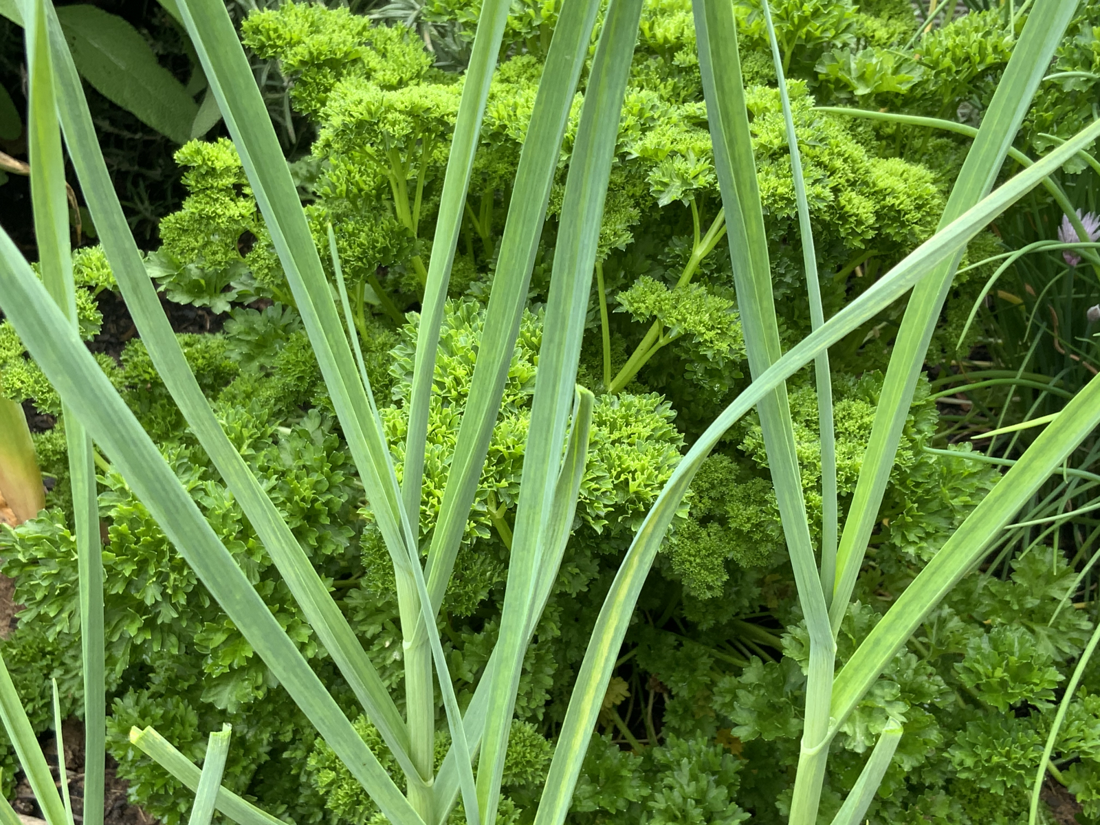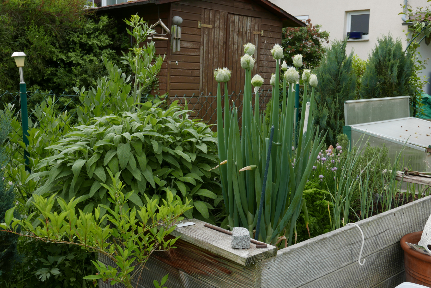 Das Hochbeet erfreut mit üppigen Kräutern und knackigem Salat. (Knoblauch und Petersilie)