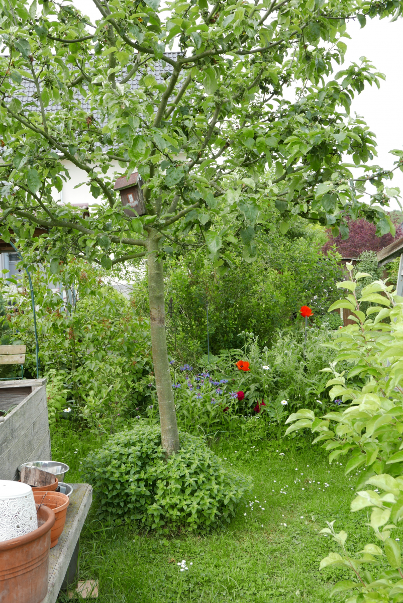 Einen herben Verlust muss ich beklagen, unser schöner Apfelbaum hat die Trockenheit der letzten Jahre nicht überlebt, er wurde vom Apfelbaum-Rußpilz befallen und in die Knie gezwungen. Er fehlt sehr im Bild des Gartens. Statt seiner werden wir im Herbst ein Stückchen weiter eine Kirsche pflanzen, sie ist nicht so trockenheitsanfällig.