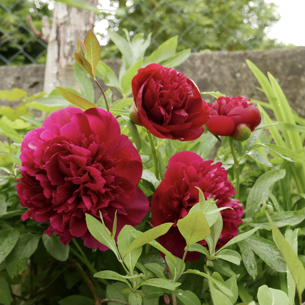 Pfingstrosen (Paeonia sp.) drängen für die kurze Zeit ihrer Blüte die winzige Eiche zur Seite.