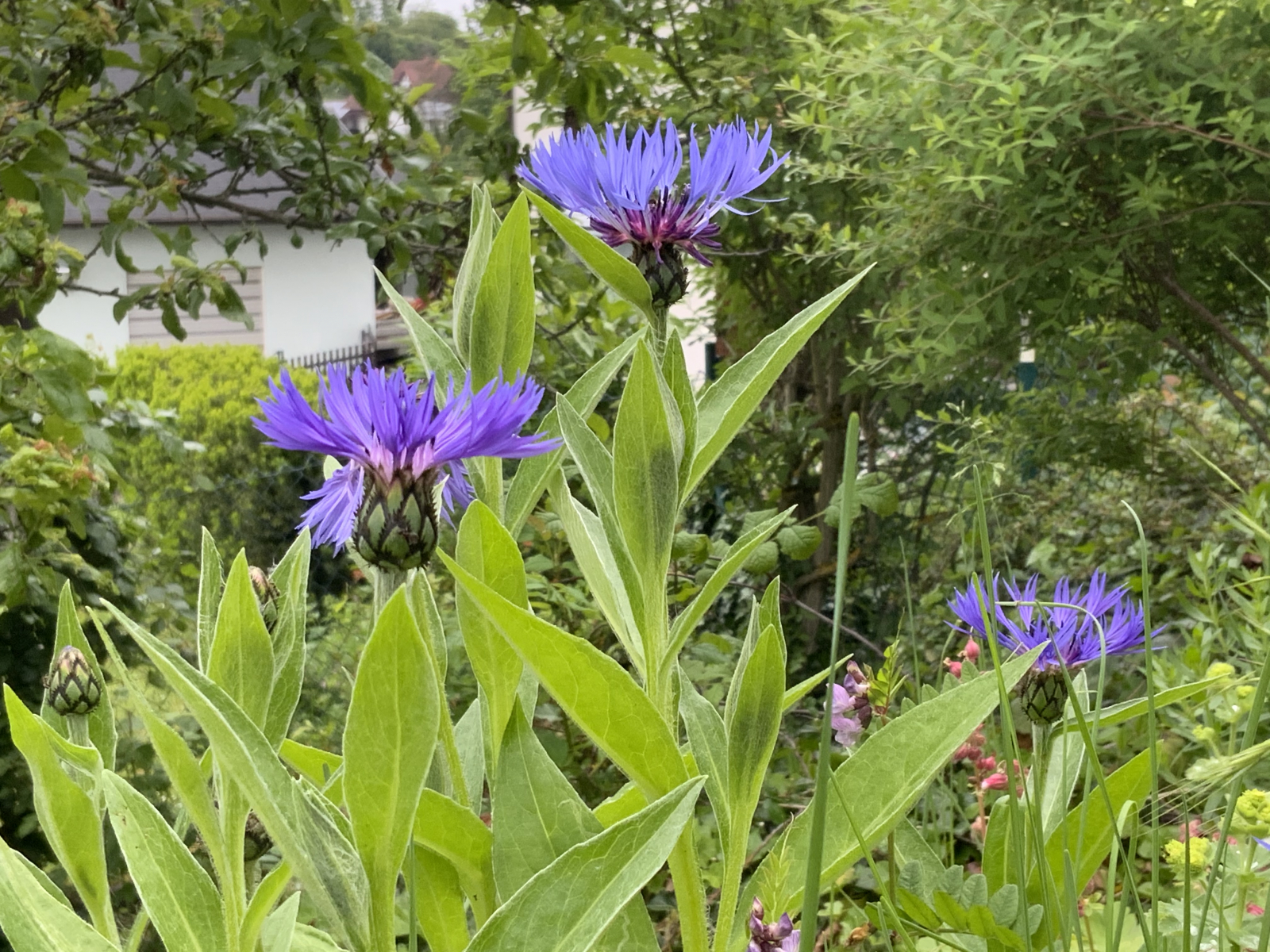 Kleine Tänzerinnen im Wind, Flockenblumen (Centaura montana Zuchtformen) und...