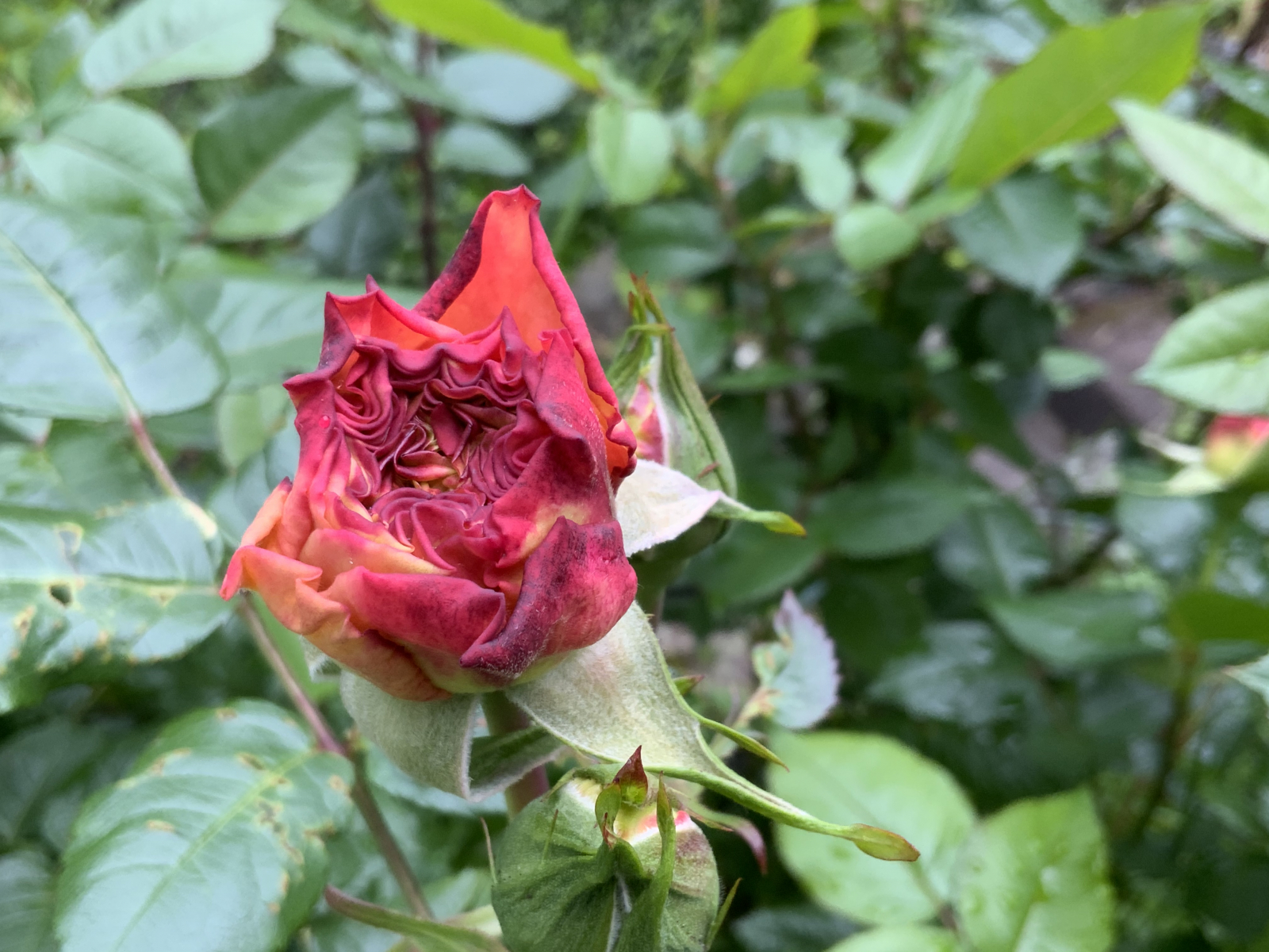 Eine meiner Lieblingsrosen, die Alba-Rose Blush Hip kletterte sowieso nicht daran hoch. Ihr kurz vor dem bersten stehenden Knospen versprechen ein baldiges Dufterlebnis.