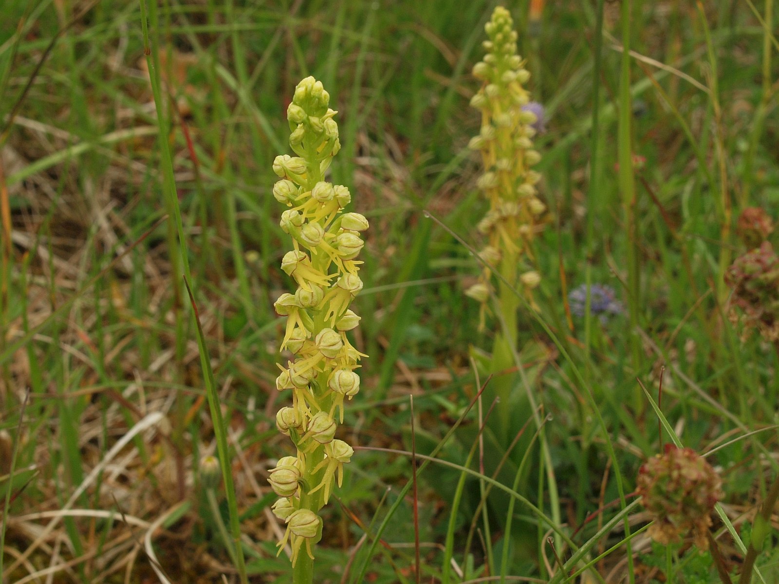 Einzelexemplar einer Hybride aus Ohnsporn und Helm-Knabenkraut (Orchis anthropophora x Orchis militaris)