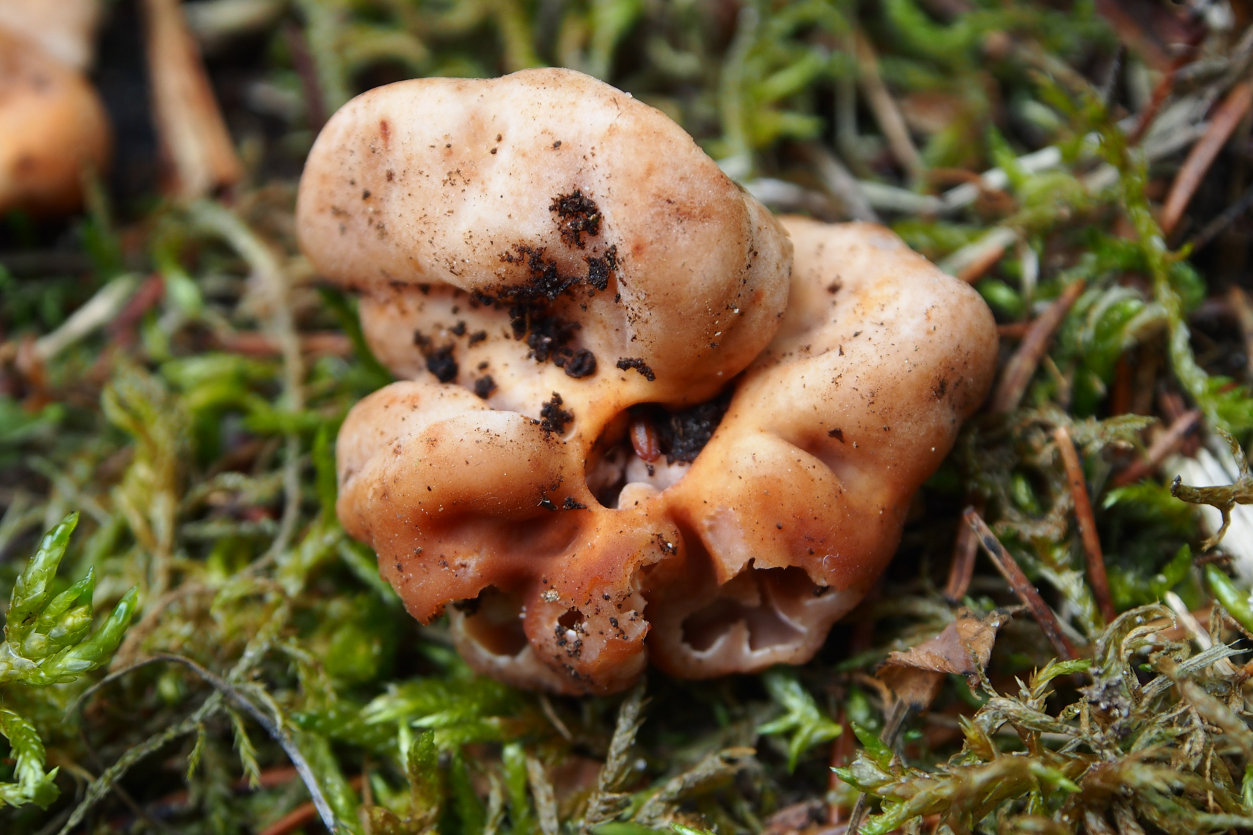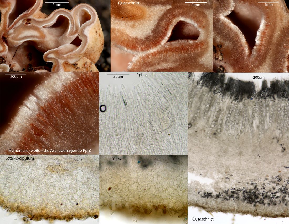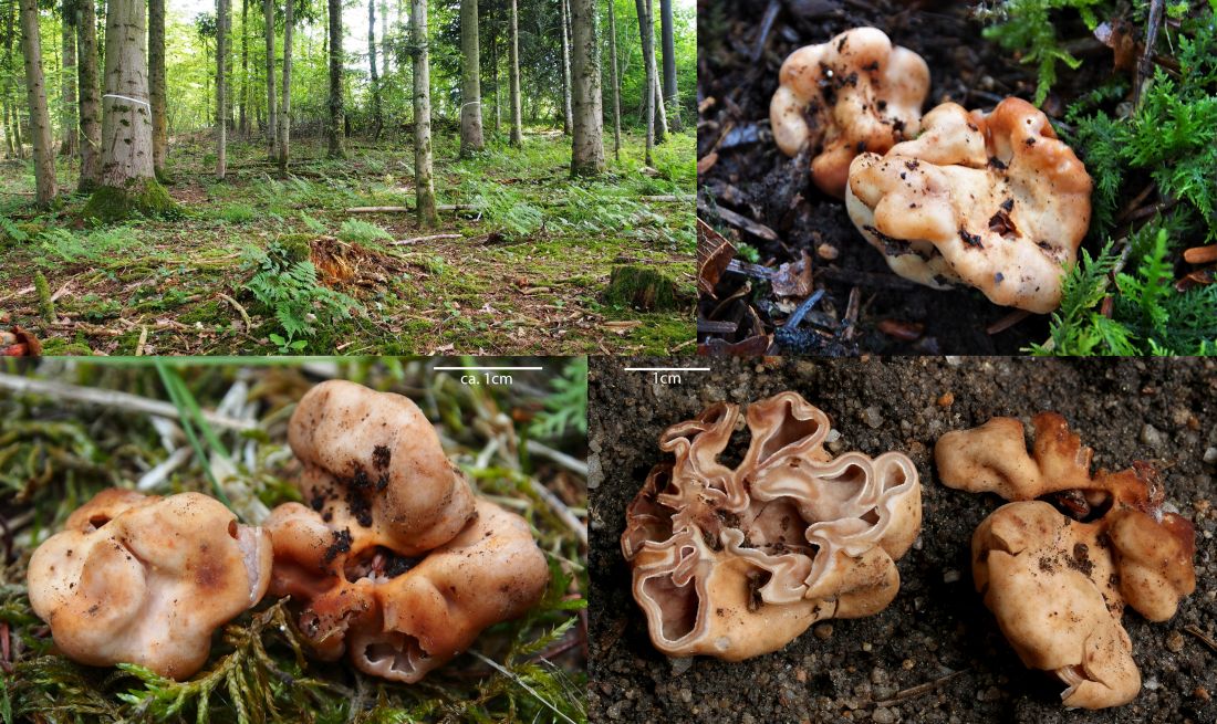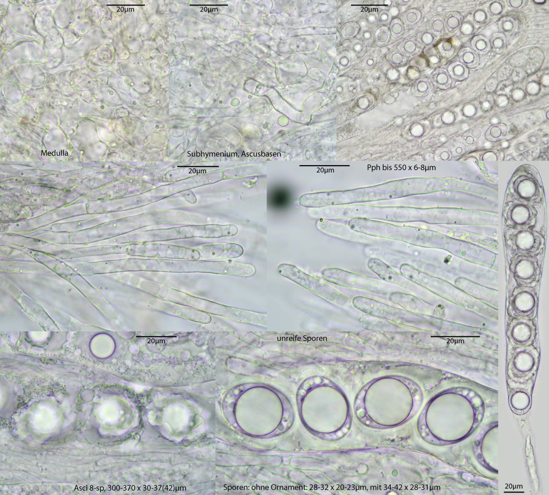 Fundort: Im Nadelstreu, überwiegend Nadelbäume - Fichten und Weißtannen, aber in nächster Nähe auch vereinzelt Eiche und Hainbuche, Höhe etwa 490 m. Erst dachte ich an eine Art Lorchel, deren Stiel im Nadelstreu eingegraben ist. Doch als ich danach puhlte, purzelten die zwei Pilze raus - ohne Stiel. Die Größe - einer etwa 2,5 cm, der andere etwa 4 cm. Das Fleisch fühlt sich fest und glatt an, Geruch konnte ich trotz Reiben nicht feststellen, außer ein bisschen nach verrottendem Nadelstreu. Daheim war der Pilz insgesamt ein bisschen nachgedunkelt, also etwas mehr Anteile an Braun. Ich hatte gehofft, er würde vielleicht über Nacht ein paar Sporen verlieren, aber er wollte nicht. ![]()