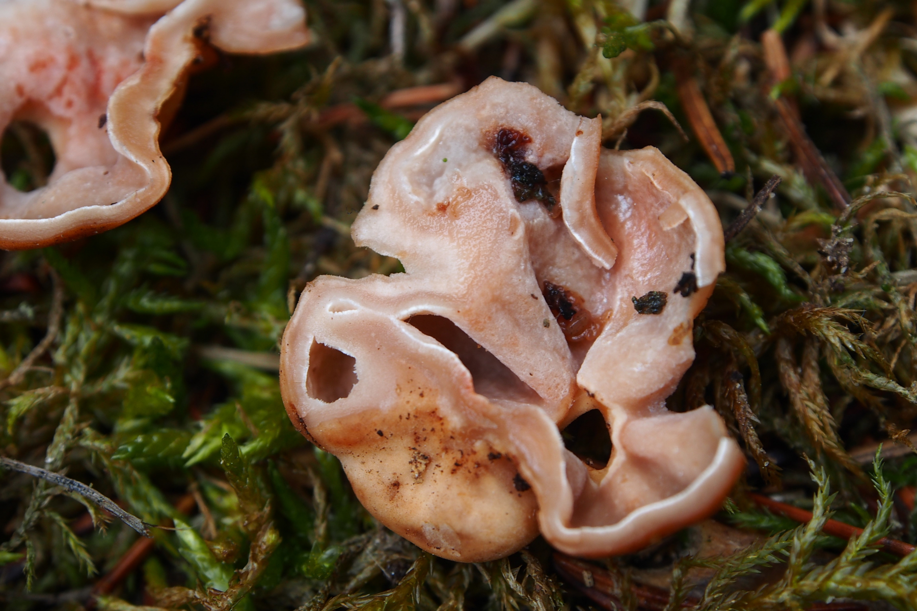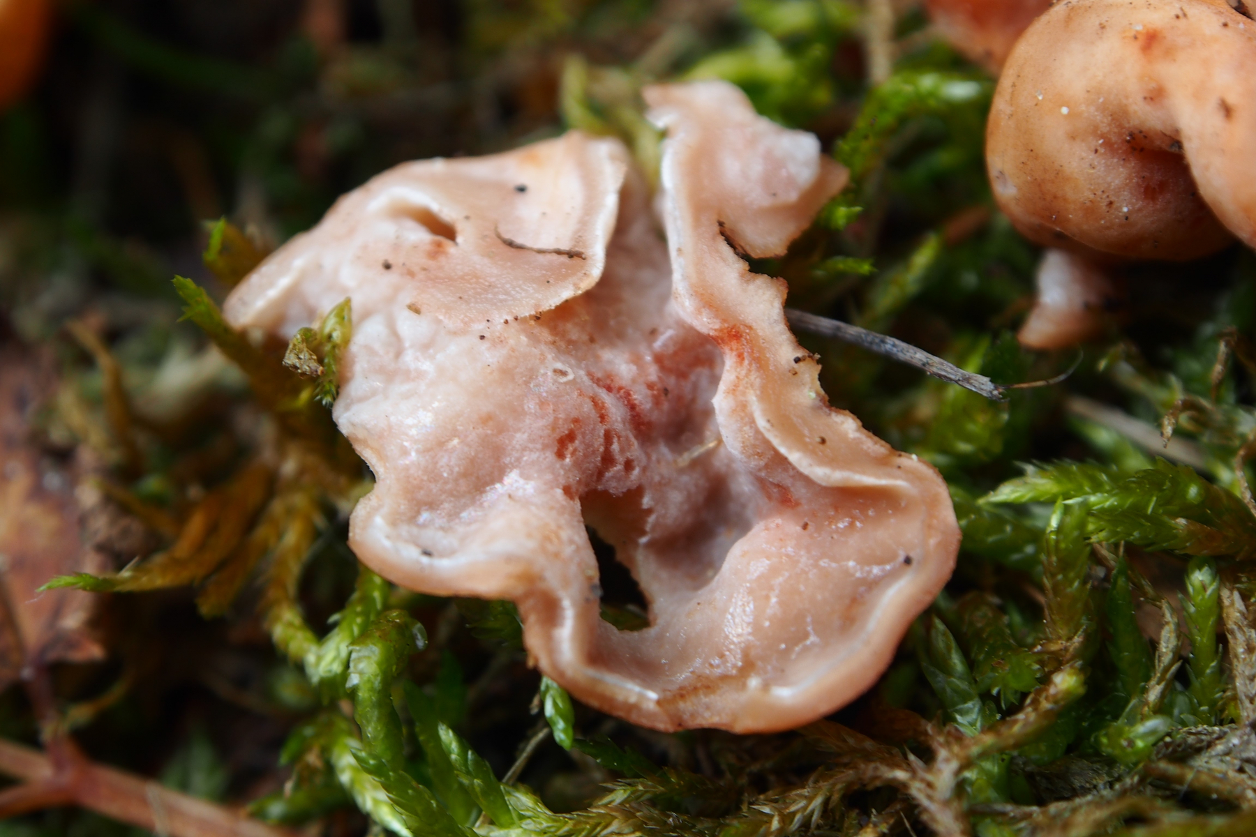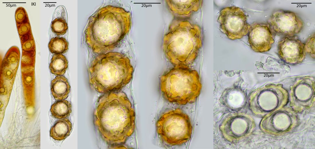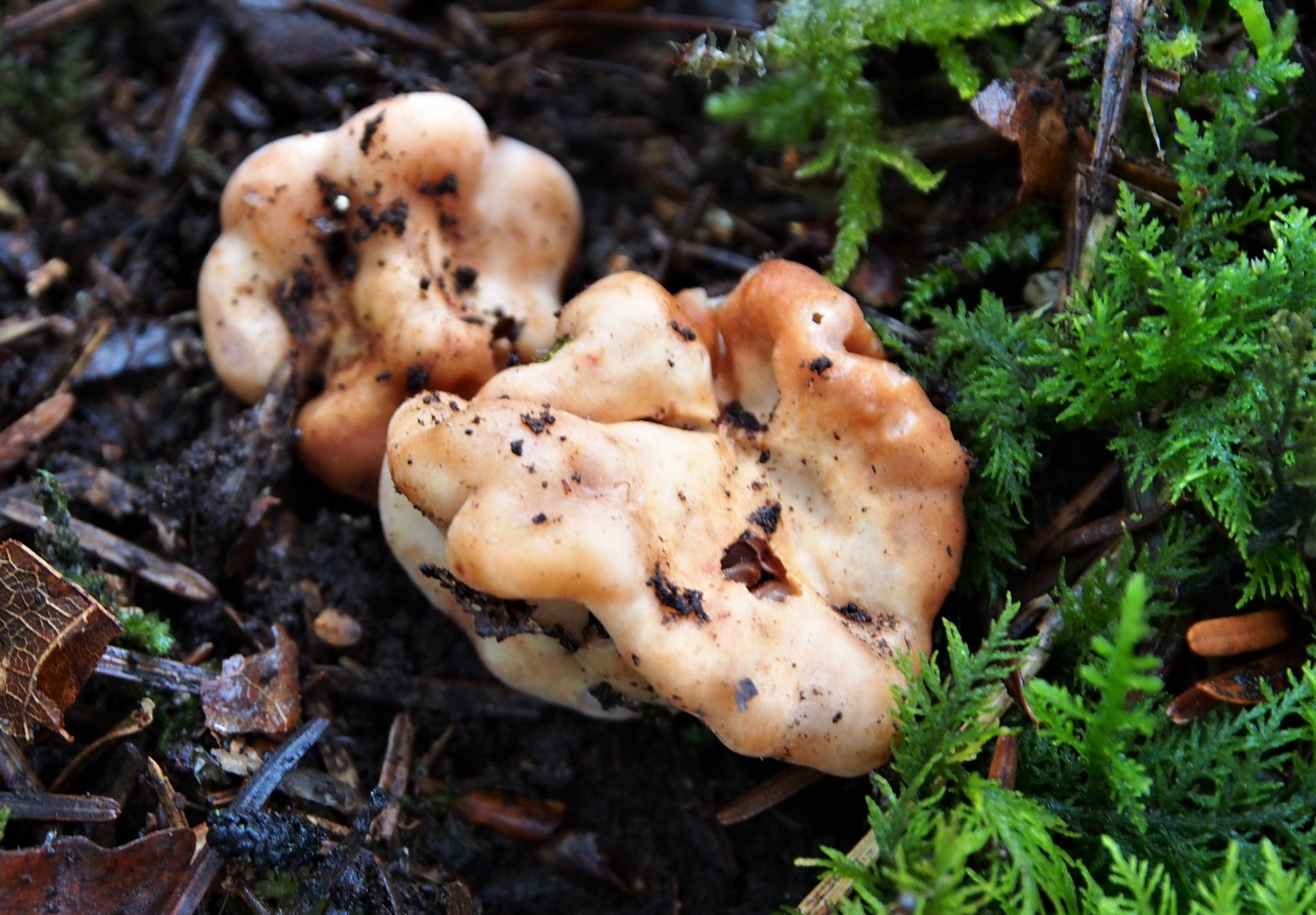 Fundort: Im Nadelstreu, überwiegend Nadelbäume - Fichten und Weißtannen, aber in nächster Nähe auch vereinzelt Eiche und Hainbuche, Höhe etwa 490 m. Erst dachte ich an eine Art Lorchel, deren Stiel im Nadelstreu eingegraben ist. Doch als ich danach puhlte, purzelten die zwei Pilze raus - ohne Stiel. Die Größe - einer etwa 2,5 cm, der andere etwa 4 cm. Das Fleisch fühlt sich fest und glatt an, Geruch konnte ich trotz Reiben nicht feststellen, außer ein bisschen nach verrottendem Nadelstreu. Daheim war der Pilz insgesamt ein bisschen nachgedunkelt, also etwas mehr Anteile an Braun. Ich hatte gehofft, er würde vielleicht über Nacht ein paar Sporen verlieren, aber er wollte nicht. ![]()