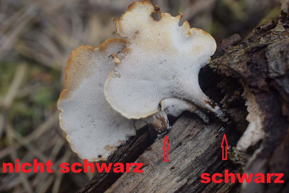 Wird die Stielbasis mit der Zeit schwarz? Da es der einzige Porling an der Fundstelle war, im Gebüsch, habe ich ihn nicht mitgenommen und könnte am Monat nochmals nach der Basis schauen, wenn er noch existiert.