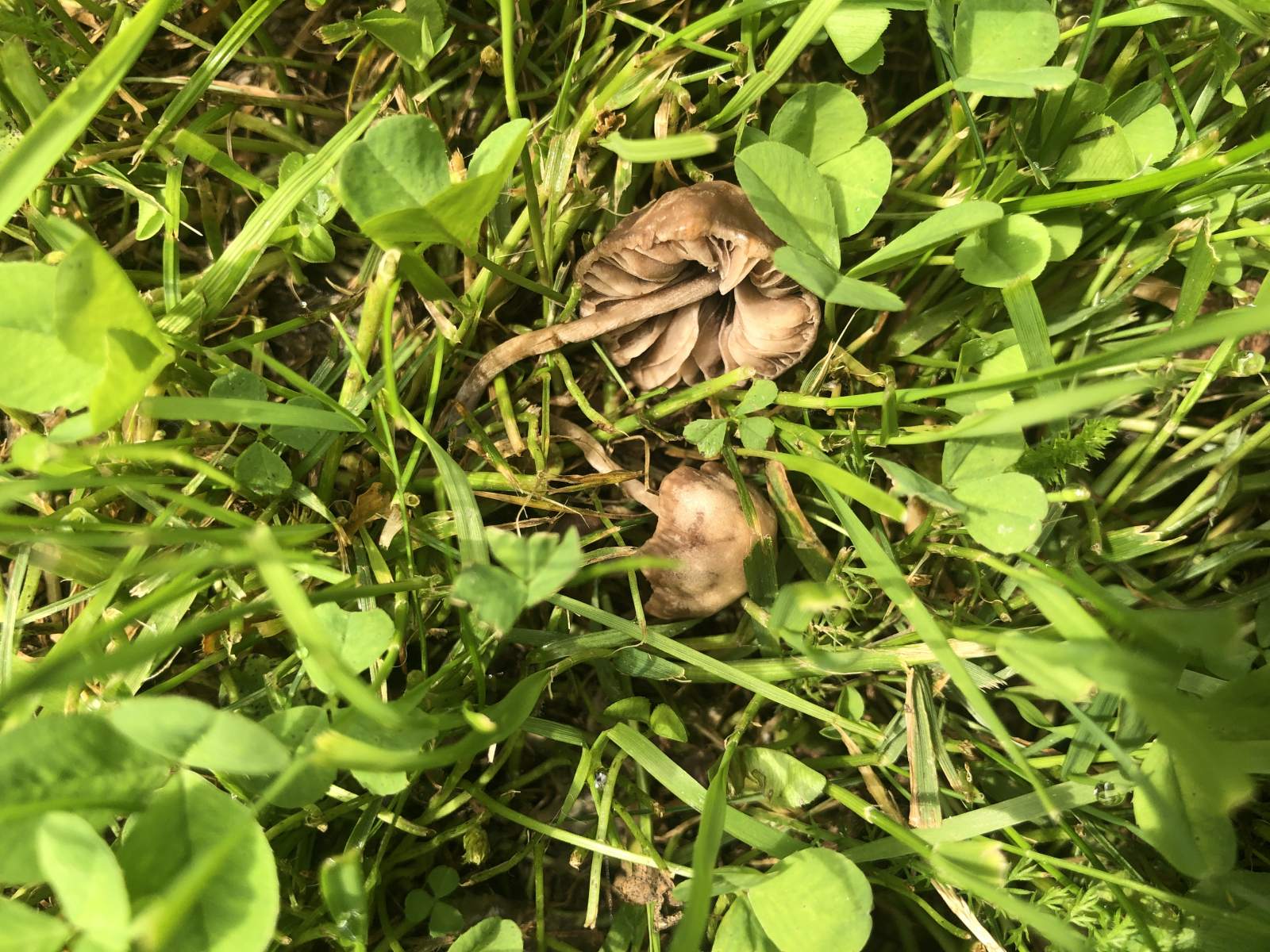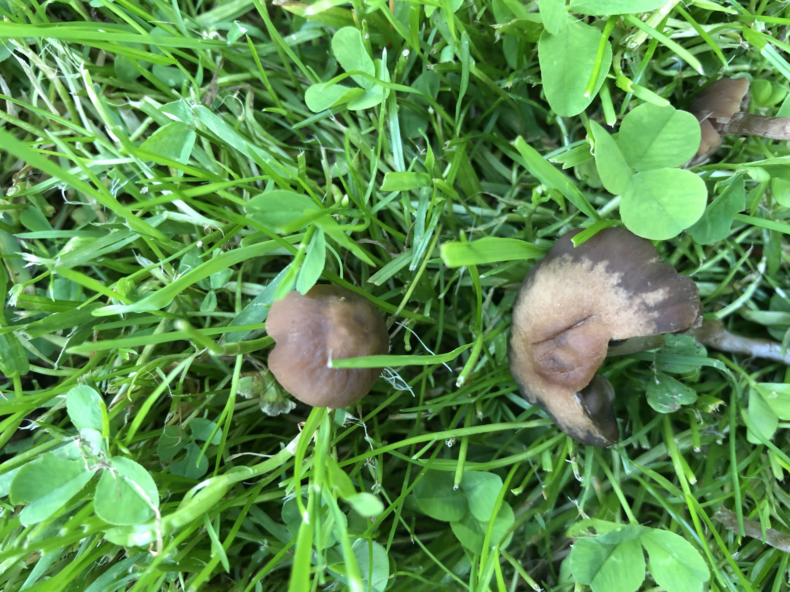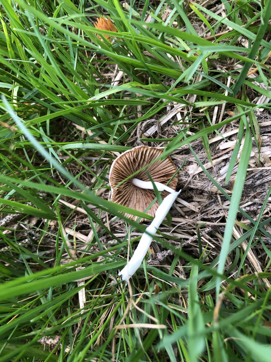 Leider müssen Hund, Katze, Reh oder ich selbst schon auf diesen Pilzen gestanden haben. Zunächst glaubte ich an Rötlinge, aber die Sporen sind zwar braun aber eher mandelförmig. Daher habe ich überhaupt keine Idee, wo ich anfangen soll zu suchen - vielleicht bei den Tubarien, aber das passt auch nicht so recht. Der Geruch war unauffällig und der Geschmack mild. Der größere Pilz hatte seine beste Zeit schon hinter sich.