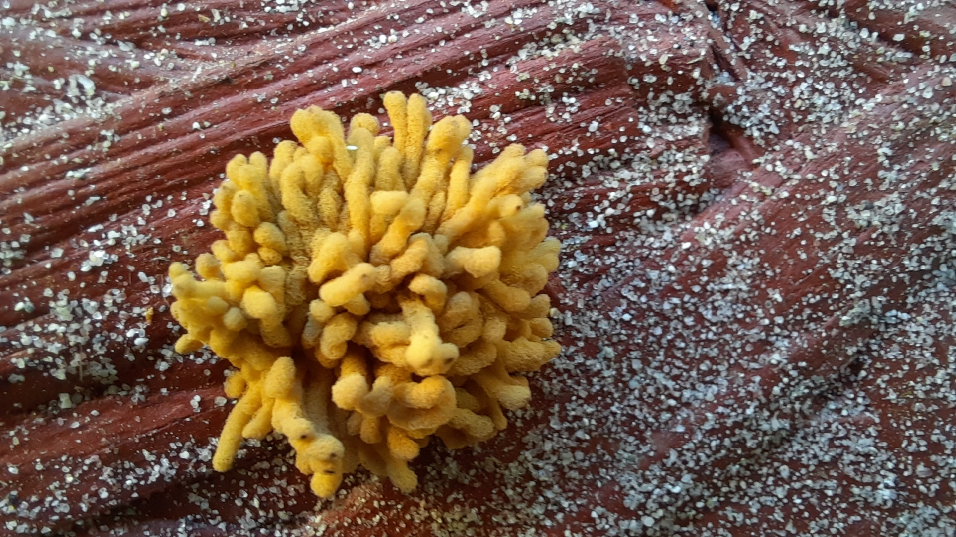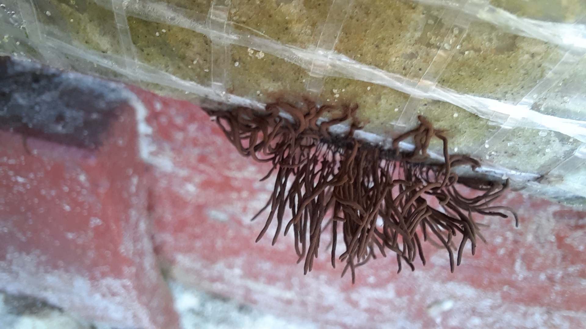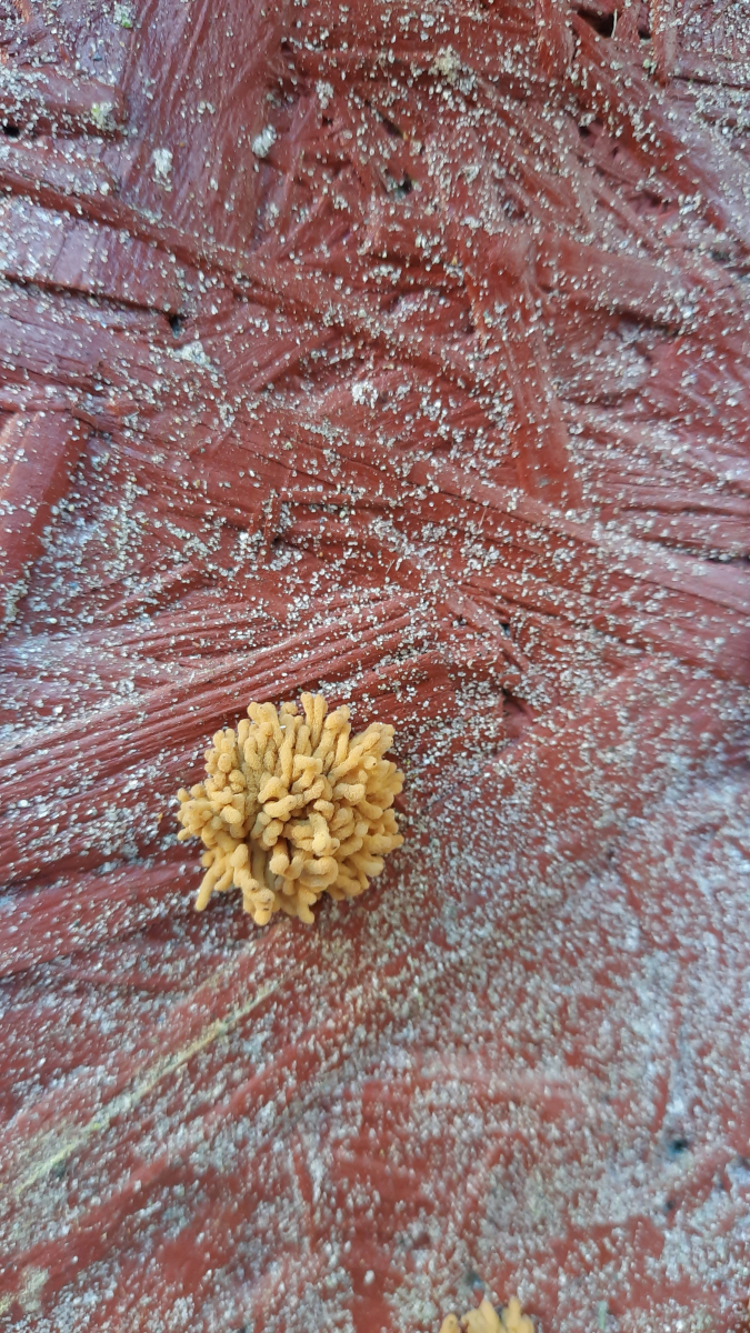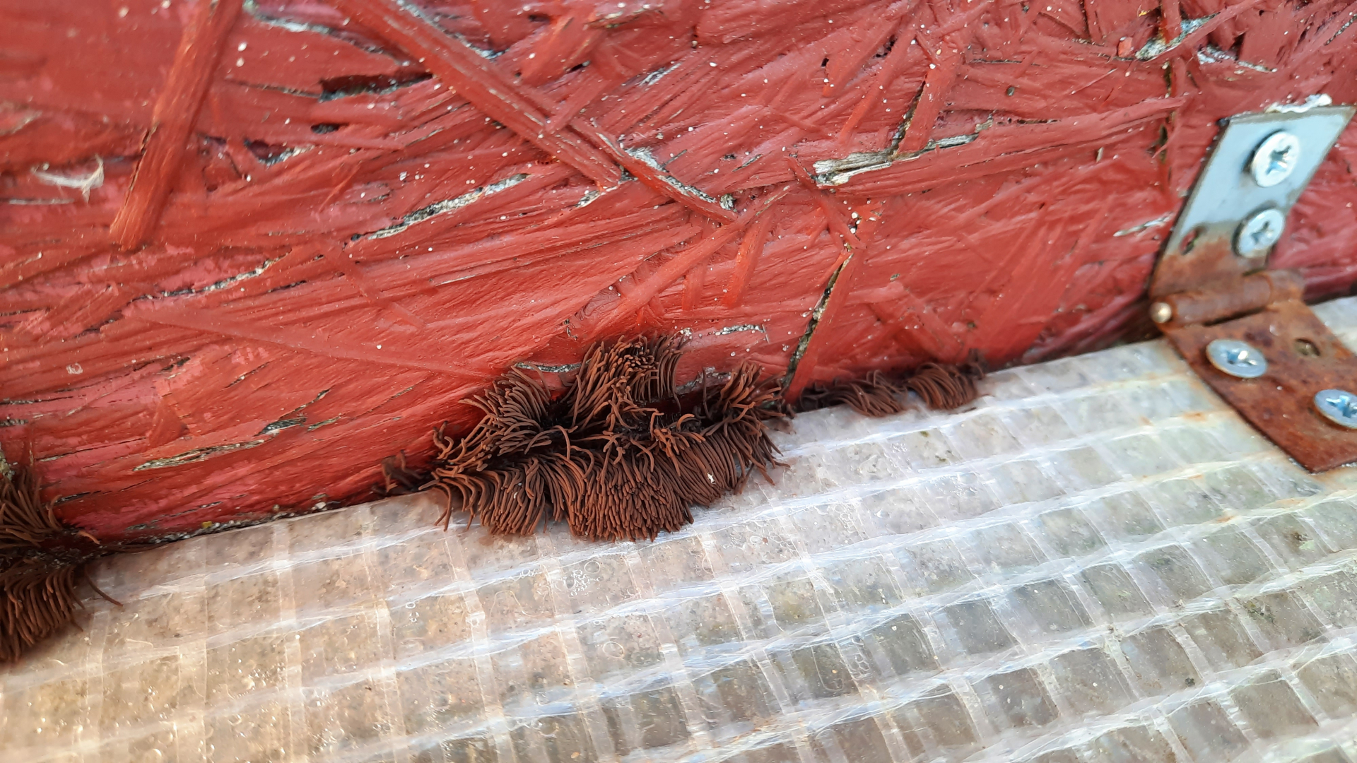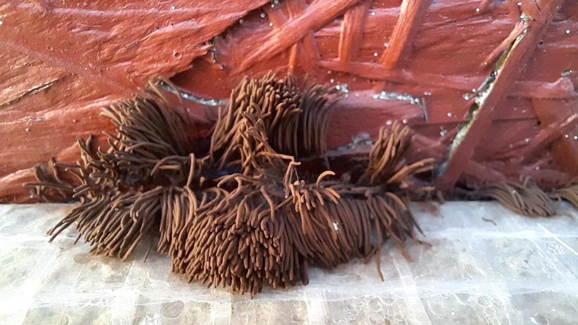 Der ockerfarbene wächst punktuell aus dem Holz in Wurm-ähnlichen fortsetzen. Der braune wächst fadenartig.
