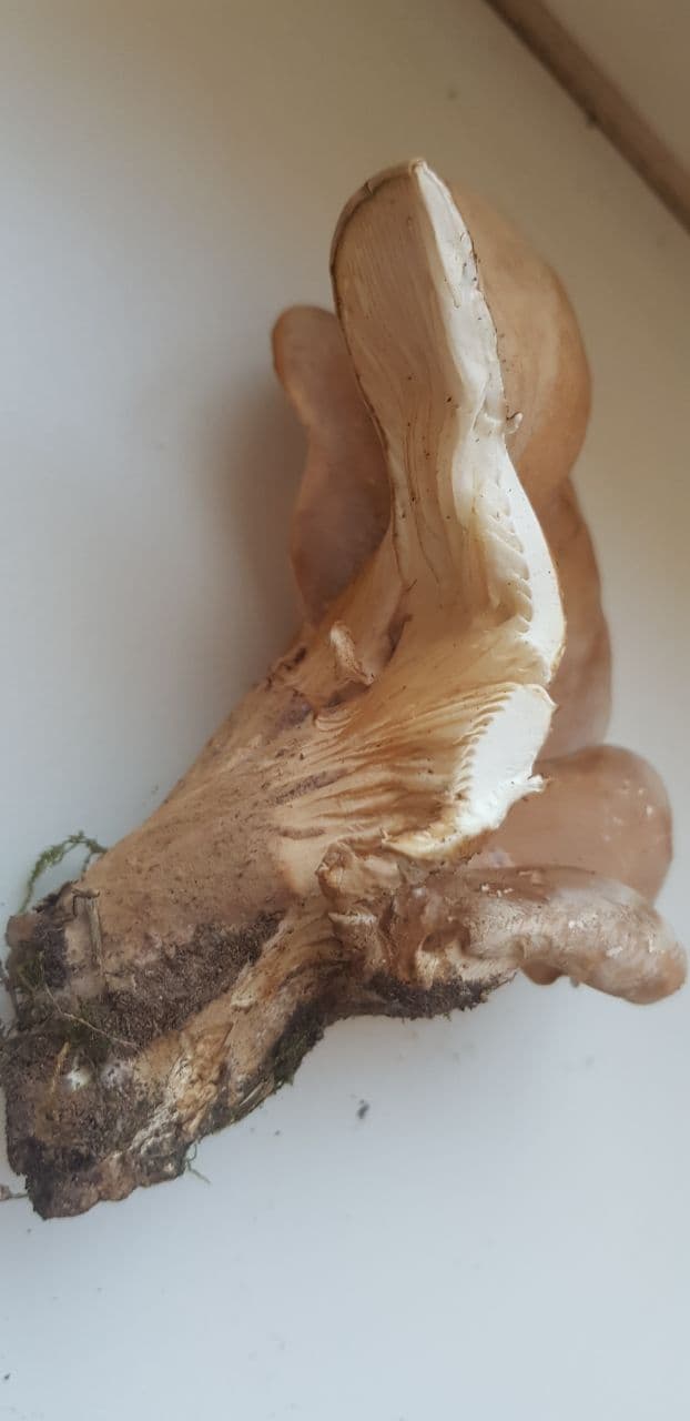 Den anderen hatte ich beim sammeln direkt als PLEUROTUS OSTREATUS eingepackt dann hab ich nochmal geschaut und war verunsichert. Alte exemplare waren schon leicht vergilbt das macht der PLEUROTUS OSTREATUS wohl auch (hab ich noch nicht gesehen) Ist es vielleicht Pleurocybelle porrigens? Aber nein, der Stiel ist wohl das beste Unterscheidungs Merkmal oder?