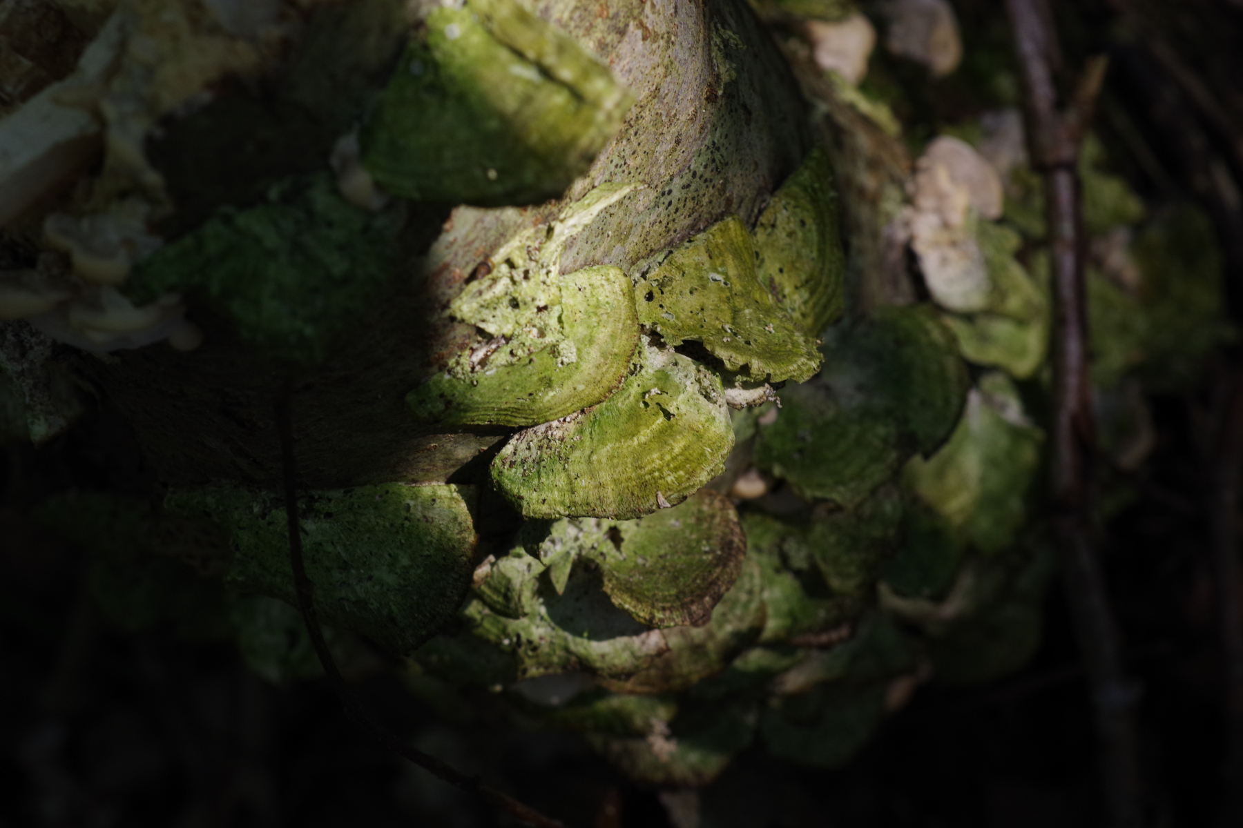 Auch gegen Trametes pubescens spricht, daß die alten, abgestorbenen Fruchtkörper immer noch so zahlreich und verhältnismäßig gut erhalten am Substrat sitzen. Trametes pubescens ist zwar wenn frisch auch nicht deutlich weicher als die anderen Arten aus der Gruppe, aber irgendwie lockerer aufgebaut und wird normalerweise rasant schnell von allerhand Tierchen verstoffwechselt. Solche abgestorbenen Fruchtkörper findet man von T. pubescens kaum, weil die aufgrund ihrer Konsistenz viel schneller abgebaut werden.