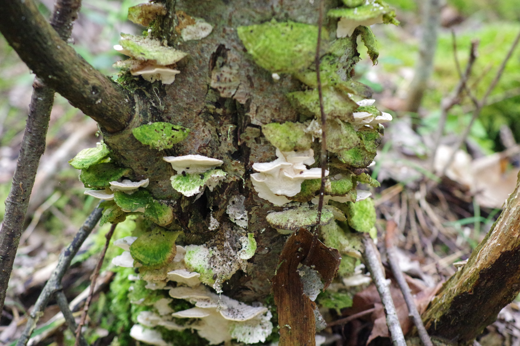 Trametes hirsuta ist durchaus eine Option für diesen Fund, auch wenn ich da zumindest bei dem fruchtkörper auf dem ersten Bild schon mal irgendwelche Haare erwarten würde.